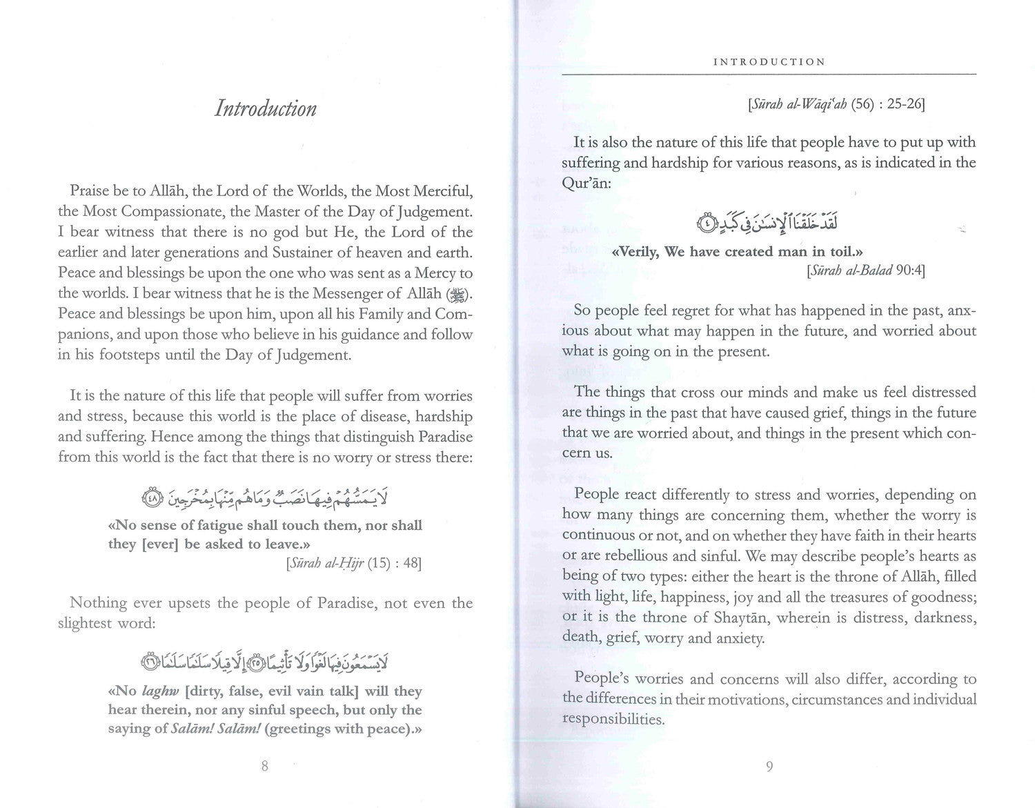 مقدمة المقدمة الحمد لله رب العالمين الرحمن الرحيم مالك يوم الدين. أشهد أن لا إله إلا هو رب الأولين والآخرين وقيوم السماوات والأرض. والصلاة والسلام على من أرسل رحمة للعالمين. وأشهد أنه رسول الله صلى الله عليه وسلم وعلى آله وصحبه أجمعين وعلى من آمن بهداه واقتدى به إلى يوم الدين. من طبيعة هذه الحياة أن يعاني الناس من الهموم والضيق، لأن هذه الدنيا دار المرض والمشقة والمعاناة. ومن بين ما يميز الجنة عن الدنيا أنه لا يوجد فيها قلق أو ضيق: لا يَمَتُهُمْ فِيهَا نَصَبٌ وَمَا هُمْ مِّنْهَا بِمُخْرَمِينَ <no sense of fatigue shall touch them nor they be asked to leave.>> [سورة الحجر (15): 48] لا شيء يزعج أهل الجنة قط ولا كلمة واحدة: لَا يَسْمَعُونَ فِيهَا لَغُوا وَلَا تَأْتِيمَان إِلَّا قِيلًا سَلَمَا سَلَمَا «لَا يَسْمَعُونَ فِيهَا لَغُوًا» [سورة الحجر (15): 48] . سلام! (تحية مع السلام).»> 8 [سورة الواقعة (56): 25-26] ومن طبيعة هذه الحياة أيضًا أن يتحمل الناس المعاناة والمشقة لأسباب مختلفة، كما هو مبين في القرآن: «لَقَدْ خَلَقْنَا الْإِنسَانَ فِي كَبَدٍ» [سورة البلد 90:4] لذلك يشعر الناس بالندم على ما حدث في الماضي، والقلق بشأن ما قد يحدث في المستقبل، والقلق بشأن ما يجري في الحاضر. الأشياء التي تخطر ببالنا وتجعلنا نشعر بالضيق هي أشياء في الماضي تسببت في الحزن، وأشياء في المستقبل تقلقنا، وأشياء في الحاضر تهمنا. يتفاعل الناس بشكل مختلف مع التوتر والقلق، اعتمادًا على عدد الأشياء التي تهمهم، وما إذا كان القلق مستمرًا أم لا، وما إذا كان لديهم إيمان في قلوبهم أم أنهم متمردون ومذنبون. يمكن وصف قلوب الناس بأنها نوعان: إما أن يكون القلب عرش الله، مملوءًا بالنور والحياة والسعادة والفرح وكنوز الخير، وإما أن يكون عرش الشيطان، فيه الضيق والظلمة والموت والحزن والهم والغم. وتختلف هموم الناس ومشاكلهم باختلاف دوافعهم وظروفهم ومسؤولياتهم.