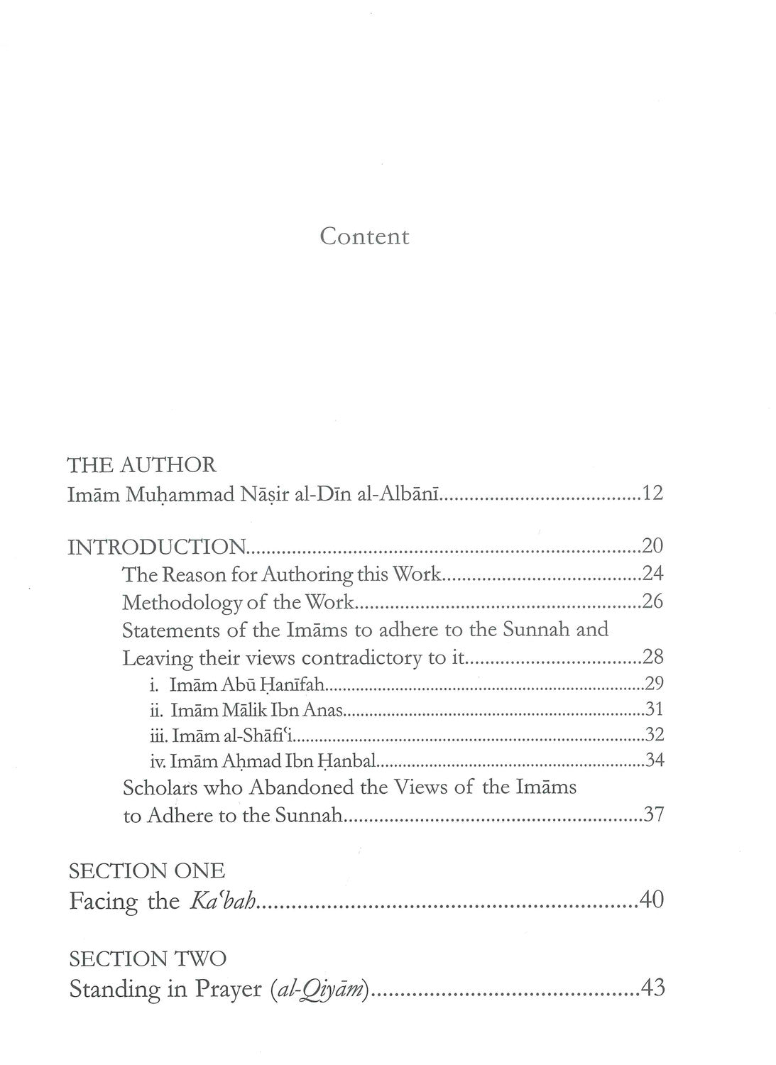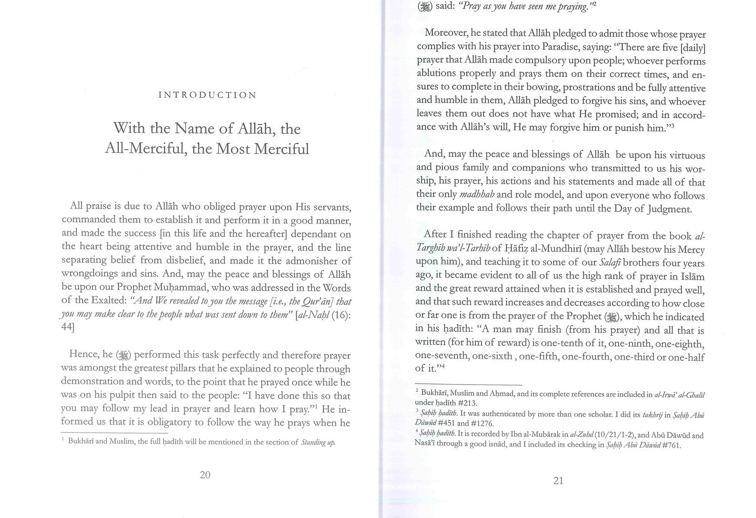 وصف صلاة النبي لليلة صفة صلاة النبي من التكبير إلى التسليم كانك تراها الإمام محمد ناصر الدين الألباني الصلاة عبادة أساسية ومركزية في الإسلام؛ ولا يمكن التأكيد على أهميتها بما فيه الكفاية. يسعى المسلمون إلى إتقان صلاتهم لأنها في الواقع خط فاصل بين الإيمان والكفر، وستكون أيضًا أول ما يسأل عنه البشر يوم القيامة. لذلك تم تخصيص الكثير لموضوع الصلاة من مجموعة واسعة من الأدب الإسلامي - من أحكامها إلى التفاصيل الدقيقة لخصائصها وما إلى ذلك. صفة صلاة النبي هو عمل مشهور للإمام وعالم الحديث محمد ناصر الدين الألباني (رحمه الله). كان العمل الأصلي باللغة العربية معلمًا فريدًا من نوعه يمنح نهجًا جديدًا في تقديم الموضوع. لذلك نحن فخورون بتقديم الترجمة الإنجليزية له أمام القارئ. أشار المؤلف بوضوح إلى هدفه من تأليف هذا الكتاب، حيث قال: "لم أجد كتابًا (عن الصلاة) يتناول هذا الموضوع بشكل شامل، لذا وجدتُ نفسي مضطرًا لتأليف كتاب يجمع أكبر قدر ممكن من سمات صلاة النبي صلى الله عليه وسلم، من التكبير إلى التسليم...". كما أكد على منهجيته المفضلة في الكتاب، من خلال تبني مبادئ صارمة للالتزام بالسنة الصحيحة، والمهمة الصعبة التي واجهها في ضمان الالتزام بهذه المبادئ. ومنذ ذلك الحين، تطور الكتاب ليصبح مرجعًا دراسيًا ومنهجًا تمهيديًا يُدرس ويُدرس في جميع أنحاء العالم الإسلامي. وهو يضع معيارًا لإحياء نهج شامل للصلاة، وبالتالي وسيلةً لإتقان عبودية الله. نأمل أن تضمن هذه الترجمة الإنجليزية الجديدة استمرارًا جادًا في مساعدة المسلمين على اتباع هدي النبي صلى الله عليه وسلم في عباداتهم اليومية. وأن يصبح تطبيق هذا الكتاب حافزًا لمن يحبون... النبي يُنفّذ أمره: "صلّوا كما رأيتموني أصلي". في لسنة تفضلوا بزيارتنا www.darassunnah.com ISBN-13: 978-19043364-5-7 ISBN-10: 1-904336-45-0 دار السنة للنشر، صندوق بريد 9818، برمنغهام، B11 4WA، المملكة المتحدة. البريد الإلكتروني: info@darassunnah.com www.darassunnah.com جميع الحقوق محفوظة لدار السنة للنشر 9 781904 336457 >
