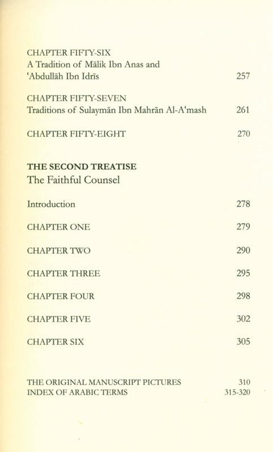 الفصل السادس والخمسون حديث مالك بن أنس وعبد الله بن إدريس 257 الفصل السابع والخمسون حديث سليمان بن مهران الأعمش 261 الفصل الثامن والخمسون 270 الرسالة الثانية النصيحة الأمينة مقدمة 278 الفصل الأول 279 الفصل الثاني 290 الفصل الثالث 295 الفصل الرابع 298 الفصل الخامس 302 الفصل السادس 305 المخطوطة الأصلية فهرس المصطلحات العربية 310 315-320