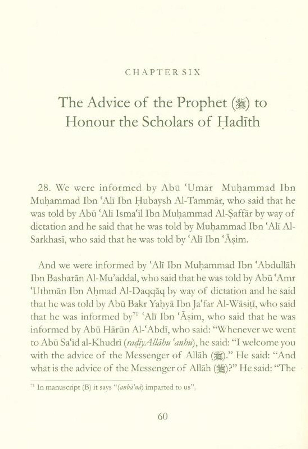 الباب السادس في وصية النبي صلى الله عليه وسلم بإكرام علماء الحديث 28. أخبرنا أبو عمر محمد بن محمد بن علي بن حبيش التمار، قال: حدثني أبو علي إسماعيل بن محمد الصفار إملاءً، وقال: حدثني محمد بن علي السرخسي، قال: حدثني علي بن عاصم. "وحدثنا علي بن محمد بن عبد الله بن بشران المعدل، حدثني أبو عمرو عثمان بن أحمد الدقاق إملاءً، حدثني أبو بكر يحيى بن جعفر الواسطي، حدثني علي بن عاصم، حدثني أبو هارون العبدي، قال: كنا إذا دخلنا على أبي سعيد الخدري رضي الله عنه قال: أرحب بكم بنصيحة رسول الله صلى الله عليه وسلم، قال: وما نصيحة رسول الله صلى الله عليه وسلم؟ قال: أنبأنا". 60