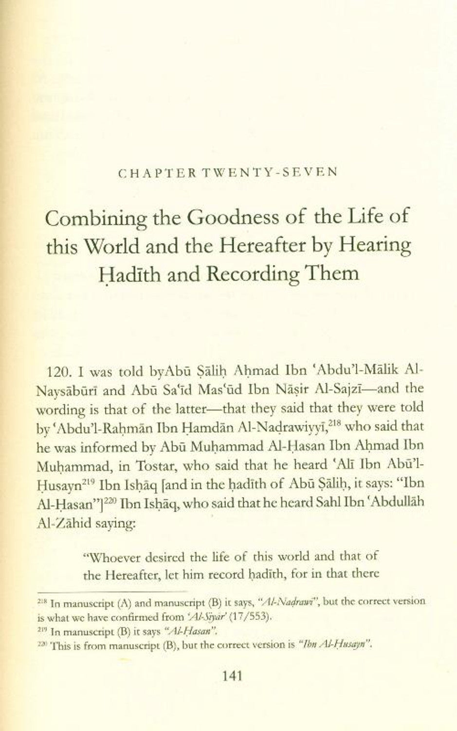 الباب السابع والعشرون في الجمع بين خيري الدنيا والآخرة بسماع الحديث وتدوينه 120. حدثني أبو صالح أحمد بن عبد الملك النيسابوري وأبو سعيد مسعود بن ناصر السجزي - ولفظ الأخير - أنهما حدثا عبد الرحمن بن حمدان الندراوي، 218 قال أخبرني أبو محمد الحسن بن أحمد بن محمد بتستر أنه سمع علي بن أبي الحسين 219 ابن إسحاق [وفي حديث أبي صالح: "ابن الحسن" 220 ابن إسحاق، قال: سمع سهل بن عبد الله "قال الزاهد: من أراد الدنيا والآخرة فليكتب الحديث، فإن في ذلك 218 وفي المخطوطة (أ) والمخطوطة (ب) «النضرة»، والصحيح ما أثبتناه من السير (17/553). 219 وفي المخطوطة (ب) «الحسن». 23) هذا من المخطوطة (ب)، والصحيح «ابن الحسين». 141