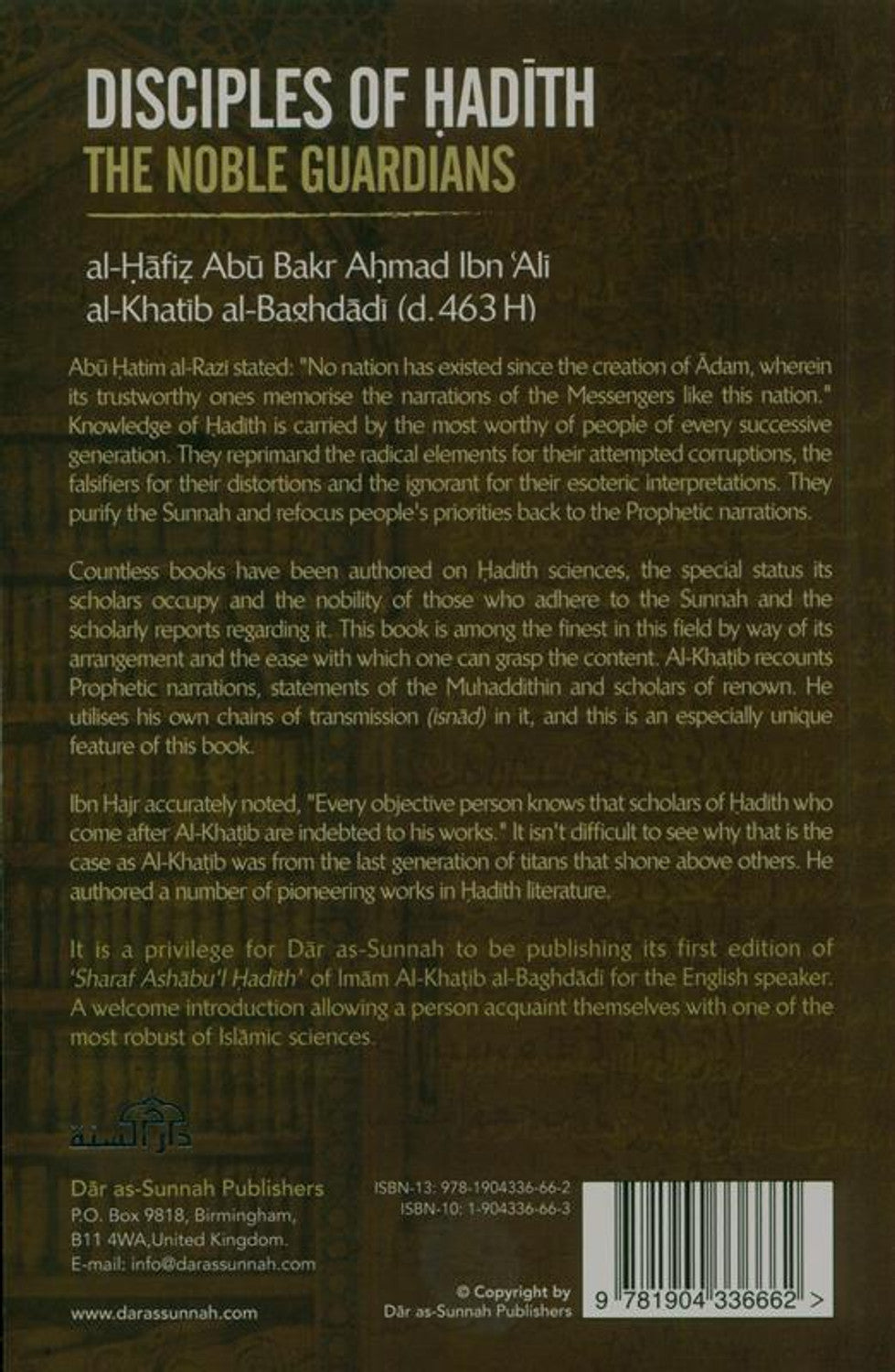 تلاميذ الحديث الأوصياء الكرام الحافظ أبو بكر أحمد بن علي الخطيب البغدادي (ت 463 هـ). قال أبو حاتم الرازي: "لم توجد أمة منذ خلق آدم يحفظ أمناؤها أحاديث الرسل مثل هذه الأمة". يحمل علم الحديث أحق الناس به من كل جيل. يوبخون المتطرفين على تحريفهم، والمبطلين على تحريفهم، والجهلة على تأويلاتهم الباطنية. ينقّون السنة ويعيدون ترتيب أولويات الناس إلى الأحاديث النبوية. وقد ألفت كتب لا تحصى في علوم الحديث، ومكانة علمائه، وشرف المتمسكين بالسنة والآثار الواردة فيها. يُعد هذا الكتاب من أرقى الكتب في هذا المجال، من حيث ترتيبه وسهولة استيعاب محتواه. يروي الخطيب أحاديث نبوية، وأقوال المحدثين والعلماء المشهورين، مستخدمًا أسانيده الخاصة، وهذه ميزة فريدة لهذا الكتاب. وقد أشار ابن حجر بدقة إلى ذلك بقوله: "يعلم كل عاقل أن علماء الحديث من بعد الخطيب مدينون له بمؤلفاته". وليس من الصعب إدراك سبب ذلك، فالخطيب كان من آخر جيل من العظماء الذين بزغوا فوق غيرهم. وقد ألّف عددًا من المؤلفات الرائدة في أدب الحديث. ويشرف دار السنة أن تنشر طبعتها الأولى من كتاب "شرف أصحاب الحديث" للإمام الخطيب البغدادي للناطقين باللغة الإنجليزية. إنه مقدمة رائعة تُتيح للقارئ التعرّف على أحد أقوى العلوم الإسلامية. دار السنة دار السنة للنشر ص.ب 9818، برمنغهام، B11 4WA، المملكة المتحدة. البريد الإلكتروني: info@darassunnah.com www.darassunnah.com رقم ISBN-13: 978-1904336-66-2 رقم ISBN-10: 1-904336-66-3 حقوق الطبع والنشر لـ 9 781904 336662 > دار السنة للناشرين