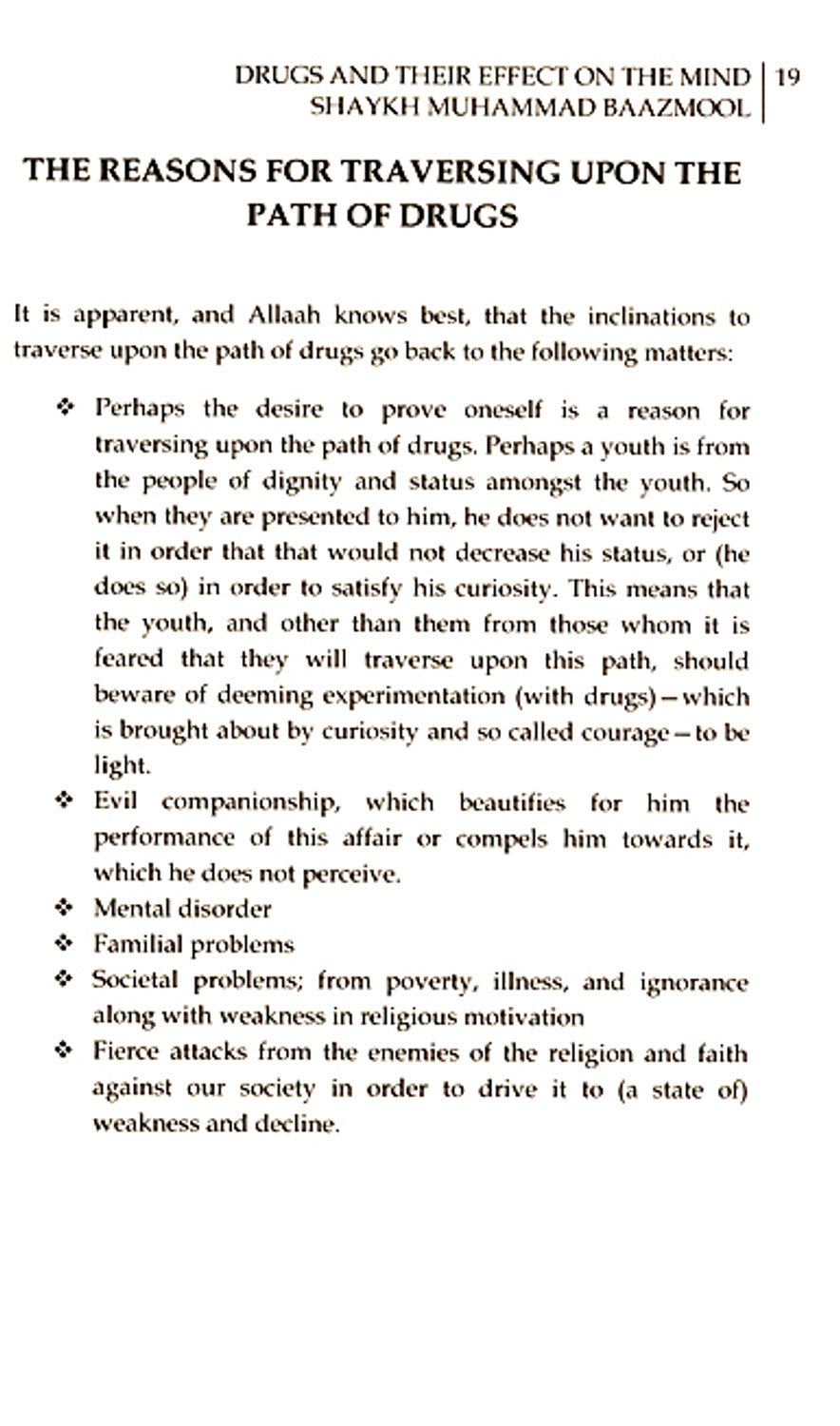 من مضاره أن يكون المدمن عبئًا على المجتمع، فلا يُثمر خيرًا لمجتمعه، ولا يُفلح فيما يُثمر. ومن مضاره أن يُبغض المدمن ويُبغض حتى من أقرب الناس إليه. ومن مضاره إضاعة المال، وعجزه عن الكسب الكريم، فيلجأ إلى كسبه بالطرق الإجرامية. أعوذ بالله مني ومنكم. ومن مضاره تدهور الصحة، والإصابة بالأمراض المستعصية التي تُودي بحياة صاحبها. ومن مضاره ضياع الكرامة، والميل إلى الفجور، من الرجال والنساء. ومن مضاره قصر العمر، لما فيه من هلاك الأعضاء، وما يُعرض الإنسان له من حزن وضيق. نفدت الكمية.