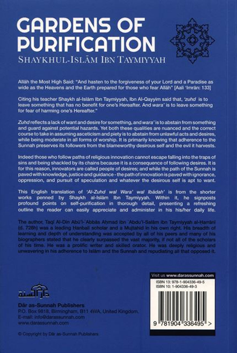جنات الطهر شيخ الإسلام ابن تيمية قال الله تعالى: {وَسَارِعُوا إِلَى مَغْفِرَةٍ مِن رَبِّكُمْ وَجَنَّةٍ عَرْضُهَا السَّمَاوَاتُ وَالْأَرْضُ أُعِدَّتْ لِلْمُتَّقِينَ} [آل عمران: ١٣٣]. وقال ابن القيم، نقلاً عن أستاذه شيخ الإسلام ابن تيمية: "الزهد ترك ما لا ينفع في الآخرة، والورع تركه خوفاً من مضاره". فالزهد عدم الرغبة في الشيء، والورع الامتناع عنه والحذر من المخاطر المحتملة. ومع ذلك، فإن هاتين الصفتين متداخلتان، والصواب في الزهد والتقوى هو الامتناع عن المحرمات والشهوات، مع الاعتدال في جميع أنواع العبادة. إن العلم بالدرجة الأولى هو أن التمسك بالسنة يحفظ أتباعها من النفس الشهوانية المذمومة وما تحصده من شرور. إن من يتبعون دروب البدع الدينية لا يمكنهم النجاة من الوقوع في فخاخ المعاصي والتقييد بسلاسلها لأنها نتيجة لاتباع الأهواء. ولهذا السبب يُطلق على المبتدعين أهل الأهواء؛ وبينما طريق السنة مفروش بالعلم والعدل والهدى، فإن طريق البدع مفروش بالجهل والظلم واتباع الظن وما تميل إليه النفس الشهوانية. هذه الترجمة الإنجليزية لكتاب "الزهد والورع والعبادة" من الأعمال القصيرة التي كتبها شيخ الإسلام ابن تيمية. وفيها، يوجه نقاطًا عميقة حول تطهير النفس بتفاصيل دقيقة، ويقدم مخططًا منعشًا يمكن للقارئ تقديره وإدارته بسهولة في حياته اليومية. كان المؤلف، تقي الدين أبو العباس أحمد بن عبد السلام بن تيمية الحراني (ت 728 هـ)، عالمًا بارزًا من علماء الحنابلة ومجتهدًا في حد ذاته. وقد أقر جميع أقرانه بسعة علمه وعمق فهمه، وذكر العديد من مدوني مدوناته أنه تفوق بوضوح على الغالبية العظمى، إن لم يكن جميع علماء عصره. كان كاتبًا غزير الإنتاج وخطيبًا ماهرًا. كان متدينًا للغاية وثابتًا في تمسكه بالإسلام والسنة، رافضًا كل ما خالفهما. تفضل بزيارتنا www.darassunnah.com ISBN 13: 978-1-904336-49-5 ISBN 10: 1-904336-49-3 دار السنة للنشر، صندوق بريد 9818، برمنغهام، 811 4WA، المملكة المتحدة. البريد الإلكتروني: info@darassunnah.com www.darassunnah.com حقوق الطبع والنشر لدار السنة ناشرون 9 781904 336495 >