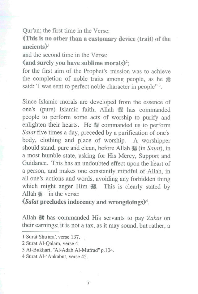 الصفحة:01 شفاء القلب د. محمد الزهراني الصفحة: 02 جدول المحتويات المقدمة حسن الخلق برّ الوالدين 4 10 17 صلة الرحم حسن الجوار الحلم 28 37 47 59 التواضع الصبر الصدق 65 72 83 الأمانة 90 الإخلاص 96 الوفاء 101 الكرم 107 المروءة 114 العفة 123 الرفق 130 العدل 134 المراجع 142 3 الصفحة: 03 بسم الله الرحمن الرحيم الرحيم مقدمة الحمد لله والصلاة والسلام على رسوله. أقدم هنا دراسة موجزة عن بعض النماذج المضيئة للقيم الأخلاقية النبيلة ومدونة السلوك في الإسلام، والتي أعددتها بالخطوات التالية: 1. تسجيل معلومات هذا البحث بأسلوب مبسط ومباشر، وهذا يمكن القارئ من الاستفادة بسهولة من هذا الموضوع. 2. توثيق جميع النصوص المتضمنة في هذا البحث، بالاعتماد إلى حد كبير على استخراجها من المصادر الإسلامية، وعلى رأسها القرآن الكريم والصحيحان وكتب المحدثين الأخرى. 3. التركيز بشدة على الموضوع المطروح في هذا البحث، دون أي إطالة، (حتى يتمكن القارئ من الحصول على المعلومات في وقت أقل) مع الحفاظ على 1 صحيحي البخاري ومسلم. 4 صفحة: 04 القرآن الكريم؛ المرة الأولى في الآية: (إن هذه إلا عادة الأولين)1 والمرة الثانية في الآية: (وإنك لعلى خلق عظيم)2؛ لأن الهدف الأول من مهمة النبي هو تحقيق اكتمال مكارم الأخلاق بين الناس، كما قال: "إنما بعثت لأتمم مكارم الأخلاق في الناس"3. ونظرًا لأن الأخلاق الإسلامية تنبع من جوهر إيمان المرء (الخالص) الإسلامي، فقد أمر الله الناس بأداء بعض العبادات لتطهير قلوبهم وتنويرها. وأمرنا بأداء الصلاة خمس مرات في اليوم، تسبقها تطهير الجسد والثياب ومكان العبادة. يجب على المصلي أن يقف طاهرًا ونظيفًا أمام الله (في الصلاة)، في حالة من التواضع الشديد، طالبًا رحمته ودعمه وهداه. وهذا له تأثير لا شك فيه على قلب الإنسان، ويجعل المرء يتذكر الله باستمرار، في جميع أفعاله وأقواله، متجنبًا أي أمر محرم قد يغضبه. وقد صرح الله بذلك بوضوح في الآية: (إن الصلاة تنهى عن الفحشاء والمنكر)". وقد أمر الله عباده بإخراج الزكاة على أرباحهم؛ وهي ليست ضريبة على ما يبدو، بل هي 1 سورة شعراء، الآية 137. 2 سورة القلم، الآية 4. 3 البخاري، "الأدب المفرد" ص104. 4 سورة العنكبوت، الآية 45. 7