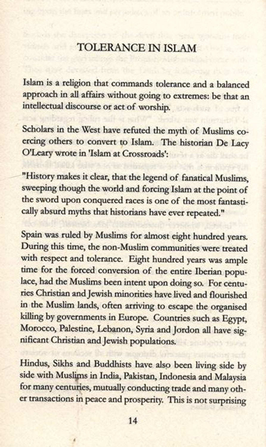 التسامح في الإسلام: الإسلام دينٌ يأمر بالتسامح والتوازن في جميع الشؤون دون تطرف، سواءً في الخطاب الفكري أو في العبادة. وقد دحض علماء الغرب خرافة إكراه المسلمين الآخرين على اعتناق الإسلام. وكتب المؤرخ دي لاسي أوليري في كتابه "الإسلام على مفترق طرق": "يُظهر التاريخ جليًا أن أسطورة المسلمين المتعصبين، الذين اجتاحوا العالم وفرضوا الإسلام بحد السيف على الأعراق المهزومة، هي من أكثر الأساطير سخافةً التي كررها المؤرخون على الإطلاق". حكم المسلمون إسبانيا لما يقرب من ثمانمائة عام. وخلال هذه الفترة، عوملت المجتمعات غير المسلمة باحترام وتسامح. كانت ثمانمائة عام فترةً كافيةً لإجبار جميع سكان شبه الجزيرة الأيبيرية على اعتناق الإسلام، لو كان المسلمون عازمون على ذلك. ولقرون، عاشت وازدهرت أقليات مسيحية ويهودية في الأراضي الإسلامية، وكثيرًا ما وصلوا هربًا من القتل المنظم الذي مارسته الحكومات في أوروبا. تضم دول مثل مصر والمغرب وفلسطين ولبنان وسوريا والأردن أعدادًا كبيرة من المسيحيين واليهود. كما عاش الهندوس والسيخ والبوذيون جنبًا إلى جنب مع المسلمين في الهند وباكستان وإندونيسيا وماليزيا لقرون عديدة، حيث كانوا يتبادلون التجارة والعديد من المعاملات الأخرى في سلام وازدهار. وهذا ليس مفاجئًا.