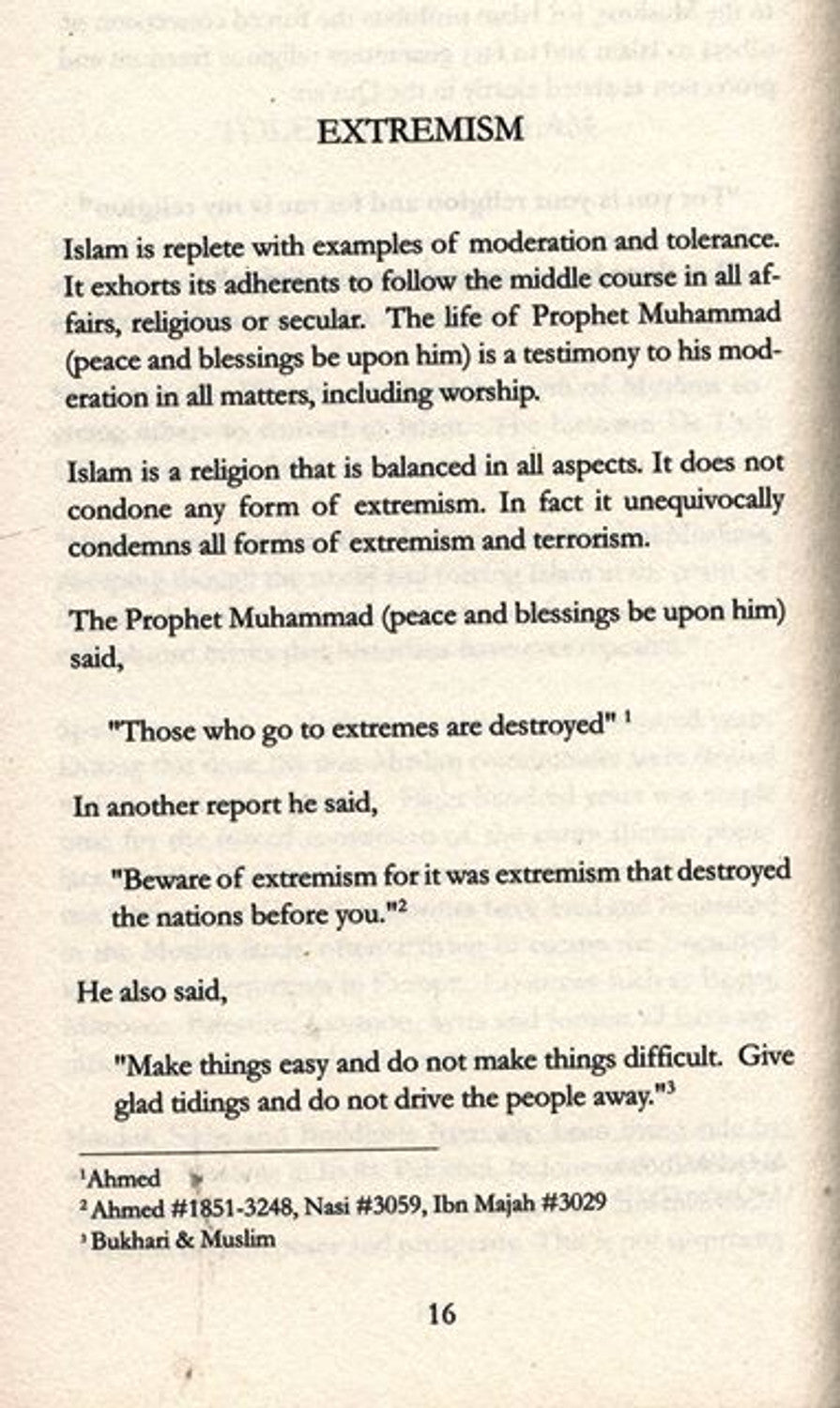 التطرف: الإسلام زاخر بأمثلة الاعتدال والتسامح. وهو يحثّ أتباعه على اتباع نهج الوسطية في جميع الشؤون، دينية كانت أم دنيوية. وحياة النبي محمد (صلى الله عليه وسلم) شاهدة على اعتداله في جميع الأمور، بما في ذلك العبادة. الإسلام دين متوازن في جميع جوانبه، لا يقر بأي شكل من أشكال التطرف، بل يدين إدانة قاطعة جميع أشكال التطرف والإرهاب. قال النبي محمد صلى الله عليه وسلم: "من تطرف فقد هلك" 1 وفي رواية أخرى قال: "إياكم والغلو، فإن الغلو أهلك الأمم قبلكم". 2 وقال أيضًا: "يسروا ولا تعسروا، وبشروا ولا تنفروا". 3 1 أحمد 2 أحمد #1851-3248، ناسي #3059، ابن ماجه #3029 البخاري ومسلم 16