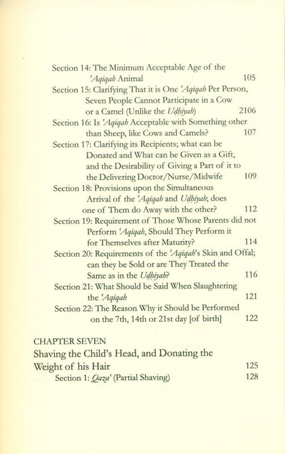 المادة 14: السن المعتبر للعقيقة المادة 15: بيان أنها عقيقة واحدة لكل شخص، ولا يشترك سبعة أشخاص في البقرة أو الإبل (بخلاف الأضحية) 105 2106 المادة 16: هل تجزئ العقيقة بغير الغنم كالبقر والإبل؟ المادة 17: بيان مستحقيها وما تجوز هبته وما تهبه واستحباب إعطاء جزء منها للطبيب/الممرضة/القابلة المولدة المادة 18: أحكام اجتماع العقيقة والأضحية، هل يسقط أحدهما الآخر؟ المادة 107 109 112 المادة 19: وجوب من لم يعق عنه والداه، هل يعق عن نفسه بعد البلوغ؟ ١١٤ الباب العشرون: شروط جلد العقيقة وأحشاءها، وهل يباعان أم يُعاملان كالأضحية؟ الباب الحادي والعشرون: ما يقال عند ذبح العقيقة؟ الباب الثاني والعشرون: حكمة ذبحها في اليوم السابع والرابع عشر والحادي والعشرين. الباب السابع: حلق رأس المولود، وإخراج وزن شعره. الباب الأول: القضاء.