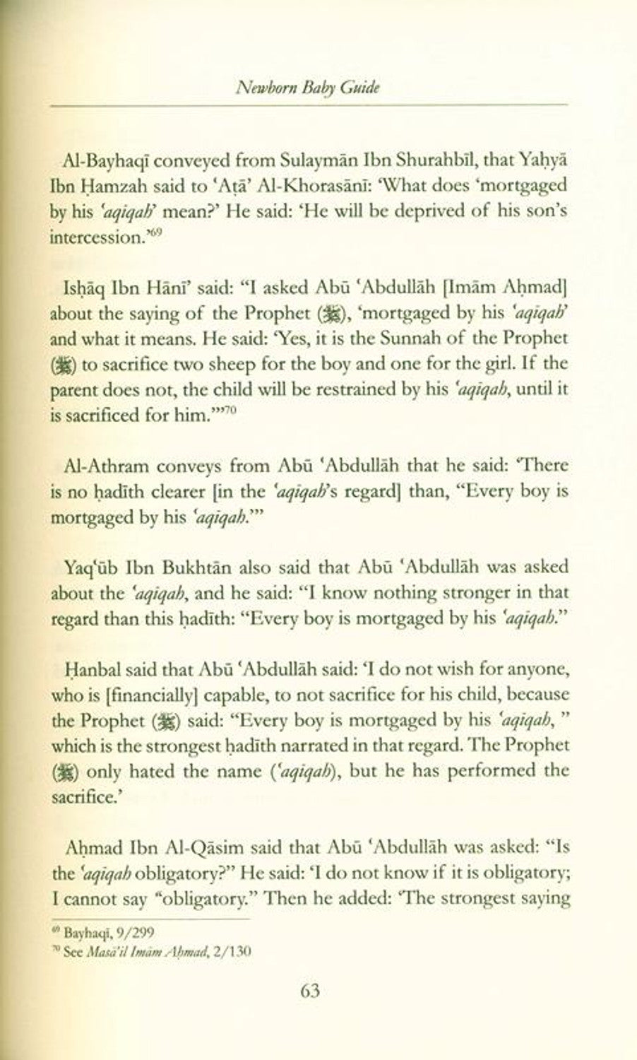 روى البيهقي عن سليمان بن شرحبيل أن يحيى بن حمزة قال لعطاء الخراساني: ما معنى (مرهون بعقيقته)؟ قال: يُحرم شفاعة ولده.69 قال إسحاق بن هانئ: سألت أبا عبد الله [الإمام أحمد] عن قول النبي صلى الله عليه وسلم: (مرهون بعقيقته) وما معناه؟ قال: نعم، من سنة النبي صلى الله عليه وسلم أن يضحي عن الغلام بشاتين وعن الجارية بواحدة، فإن لم يفعل الوالد حبس الولد بعقيقته حتى تذبح عنه.70 ونقل الأثرم عن أبي عبد الله أنه قال: ليس في العقيقة حديث أوضح من: (كل غلام مرتهن بعقيقته). وقال يعقوب بن بختان أيضا: سئل أبا عبد الله عن العقيقة فقال: لا أعلم في ذلك أقوى من هذا الحديث: (كل غلام مرتهن بعقيقته). قال حنبل: قال أبو عبد الله: لا أحب لأحدٍ مستطيعٍ ألا يضحي عن ولده، لأن النبي صلى الله عليه وسلم قال: "كل غلامٍ رهين بعقيقته"، وهو أقوى حديث روي في ذلك، وإنما كره النبي صلى الله عليه وسلم الاسم، ولكنه ضحى. قال أحمد بن القاسم: سئل أبو عبد الله: هل العقيقة واجبة؟ قال: لا أدري واجبة، لا أقول واجبة. ثم زاد: أقوى قول البيهقي، 9/299، انظر مسائل الإمام أحمد، 2/130، 63