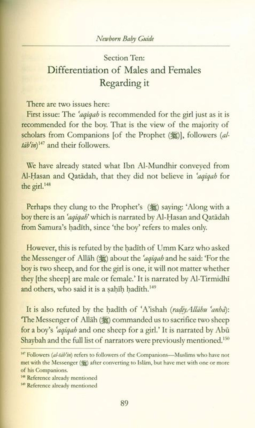 دليل المولود الجديد، القسم العاشر: التفريق بين الذكر والأنثى فيه: فيه مسألتان: المسألة الأولى: أن العقيقة تجب للأنثى كما تجب للذكر، وهو مذهب جمهور العلماء من الصحابة والتابعين 147 وتابعيهم، وقد سبق ما نقله ابن المنذر عن الحسن وقتادة من عدم اعتقادهما العقيقة للأنثى، 148 ولعلهما تمسكوا بقول النبي ﷺ: (مع الغلام عقيقة) رواه الحسن وقتادة من حديث سمرة، لأن الغلام ذكر فقط. إلا أن هذا يُدحض بحديث أم كرز أنها سألت رسول الله صلى الله عليه وسلم عن العقيقة فقال: «للغلام شاتان، وللجارية شاة واحدة، لا يضرهما ذكران أو أنثى». رواه الترمذي وغيره وقالوا إنه حديث صحيح. 149 ويُدحض أيضًا بحديث عائشة رضي الله عنها: «أمرنا رسول الله صلى الله عليه وسلم أن نذبح عن الغلام شاتين وعن الجارية شاة واحدة». رواه أبو شيبة، وقد تقدم ذكر الرواة. 150 والتابعون هم أتباع الصحابة - المسلمون الذين لم يلتقوا الرسول صلى الله عليه وسلم بعد إسلامهم، ولكن التقوا بواحد أو أكثر من أصحابه. 1 مرجع سبق ذكره 10 مرجع سبق ذكره 89
