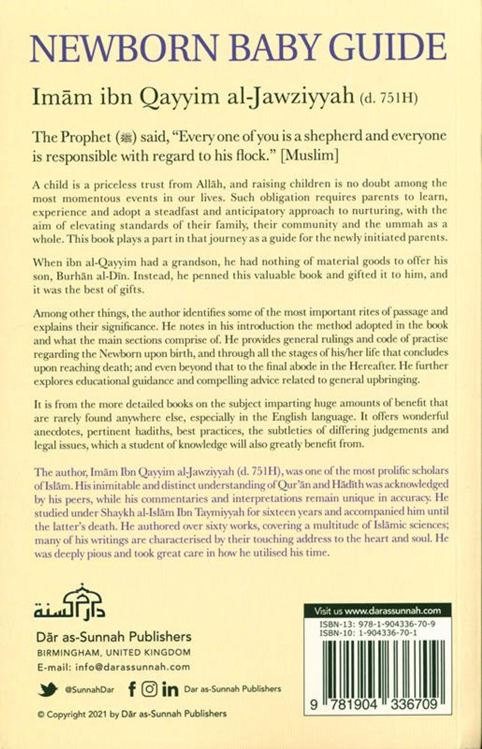 دليل المولود الجديد، الإمام ابن قيم الجوزية (ت 751 هـ). قال النبي (*): "كلكم راعٍ وكلكم مسؤول عن رعيته". [مسلم]. الطفل أمانة من الله، وتربيته بلا شك من أهمّ المناسبات في حياتنا. هذا الواجب يتطلب من الوالدين التعلم والتجربة واعتماد نهج ثابت واستباقي في التربية، بهدف الارتقاء بمستوى أسرتهم ومجتمعهم والأمة جمعاء. يلعب هذا الكتاب دورًا في هذه الرحلة كدليل للآباء والأمهات الجدد. عندما رُزق ابن القيم بحفيد، لم يكن لديه ما يُقدّمه لابنه برهان الدين، فكتب هذا الكتاب القيّم وأهداه إياه، فكان خير هدية. من بين أمور أخرى، يُحدّد المؤلف بعضًا من أهمّ مناسك العمرة ويشرح أهميتها. يُشير في مقدمته إلى المنهج المُتبع في الكتاب وما تتكون منه الأقسام الرئيسية. ويُقدم أحكامًا عامة وقواعد سلوكية تتعلق بالمولود منذ ولادته، وفي جميع مراحل حياته التي تنتهي بالوفاة؛ بل وحتى ما بعد ذلك حتى الدار الآخرة. كما يستكشف التوجيه التربوي والنصائح المُقنعة المتعلقة بالتربية العامة. وهو من الكتب الأكثر تفصيلًا في هذا الموضوع، مما يُضفي فوائد جمة قلّما تُوجد في أي مكان آخر، وخاصةً في اللغة الإنجليزية. ويُقدم قصصًا رائعة، وأحاديث ذات صلة، وأفضل الممارسات، ودقائق الأحكام المختلفة والمسائل الشرعية، والتي سيستفيد منها طالب العلم كثيرًا. كان المؤلف، الإمام ابن قيم الجوزية (ت 751هـ)، من أكثر علماء الإسلام إنتاجًا. وقد أقرّ أقرانه بفهمه الفريد والمتميز للقرآن والحديث، في حين تظل شروحه وتفسيراته فريدة في دقتها. تتلمذ على يد شيخ الإسلام ابن تيمية ستة عشر عامًا ولازمه حتى وفاته. ألف أكثر من ستين مؤلفًا، غطت علومًا إسلامية متنوعة؛ اتسمت كثير من مؤلفاته بخطابها المؤثر للقلب والروح. كان شديد التدين، حريصًا على استثمار وقته. من دار السنة للنشر، برمنغهام، المملكة المتحدة. البريد الإلكتروني: info@darassunnah.com @SunnahDar fin دار السنة للنشر. حقوق الطبع والنشر 2021 محفوظة لدار السنة للنشر. تفضل بزيارتنا على www.darassunnah.com ISBN-13: 978-1-904336-70-9 ISBN-10: 1-904336-70-1 9781904" 336709