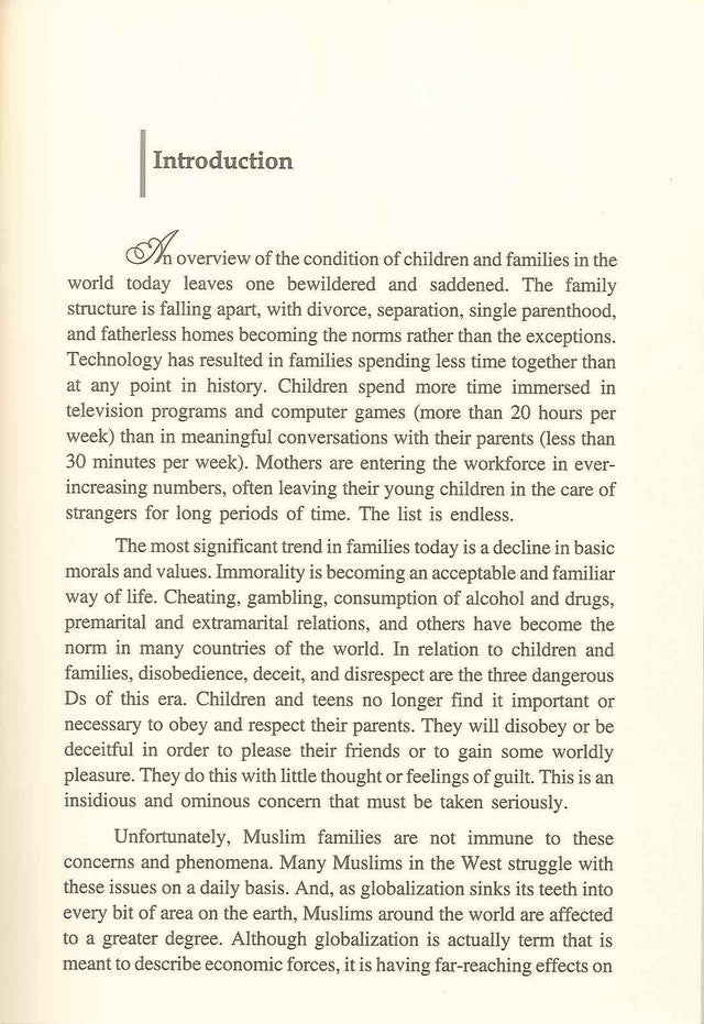 يترك عالمنا اليوم المرء في حيرة وحزن. ينهار هيكل الأسرة، حيث أصبح الطلاق والانفصال والأبوة المنفردة والبيوت التي لا أب فيها هي القاعدة لا الاستثناء. أدت التكنولوجيا إلى تقليص الوقت الذي تقضيه العائلات معًا بشكل غير مسبوق. يقضي الأطفال وقتًا أطول منغمسين في برامج التلفزيون وألعاب الكمبيوتر (أكثر من 20 ساعة أسبوعيًا) مقارنةً بالأحاديث الجادة مع والديهم (أقل من 30 دقيقة أسبوعيًا). تدخل الأمهات سوق العمل بأعداد متزايدة باستمرار، وغالبًا ما يتركن أطفالهن الصغار في رعاية غرباء لفترات طويلة. والقائمة لا تنتهي.