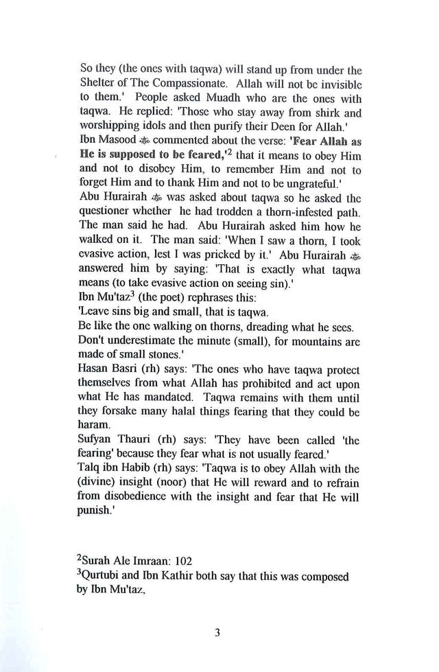 التقوى: رزق المؤمن الإمام الغزالي بن قيمي بن راجابهانبالالمُتَرَانَ اللَّهَ أَنزَلَ مِنَ السَّمَاءِ مَاءً فَصَبْحُ الْأَرْضُ مُحْضَرصدق الله العظيم الحج سورة - الآية ٦٣Al-Firdous Ltd, LondonالفردوسAL-FIRDUSAl-Firdous Ltd، LondonISBN 1-874263-20-59 781874 263203 لذا فإنهم (أصحاب التقوى) سوف يقومون من تحت مأوى الرحمن. والله لن يكون غير مرئي لهم. سأل الناس معاذًا من هم المتقون؟ قال: الذين اتقوا عن الشرك وعبادة الأوثان ثم أخلصوا لله دينهم. علق ابن مسعود على قوله تعالى: (اتقوا الله حق تقاته)2 بأنها: أن تطيعوا الله فلا تعصوه، وأن تذكروه فلا تنسوه، وأن تشكروه فلا تجحدوه. وسئل أبو هريرة عن التقوى، فسأل السائل: هل سلكت طريقًا فيه شوك؟ فقال: سلكته. فسأله أبو هريرة كيف مشيت عليه؟ فقال: كنت إذا رأيت الشوكة تهربت منها مخافة أن تشكني. فأجابه أبو هريرة: ذلك معنى التقوى. يقول ابن المعتز (الشاعر) في هذا: "اتركوا كبار الذنوب وصغائرها، فذلك التقوى. وكونوا كمن يمشي على الشوك يخشى ما يرى. لا تستهنوا بالصغير، فإن الجبال من حجارة صغار". ويقول الحسن البصري (رحمه الله): "إن المتقين يحفظون أنفسهم مما حرم الله، ويعملون بما فرضه، ولا تزال التقوى معهم حتى يتركوا حلالاً كثيراً مخافة أن يكون حراماً". ويقول سفيان الثوري (رحمه الله): "إنما سموا خائفين لأنهم يخافون مما لا يخاف عادة". قال طلق بن حبيب رحمه الله: "التقوى هي طاعة الله على بصيرة نور يثيب عليها، وترك معصيته على بصيرة وخوف عقابه". سورة آل عمران: 1023. وقال القرطبي وابن كثير: هذا من تأليف ابن معتز.