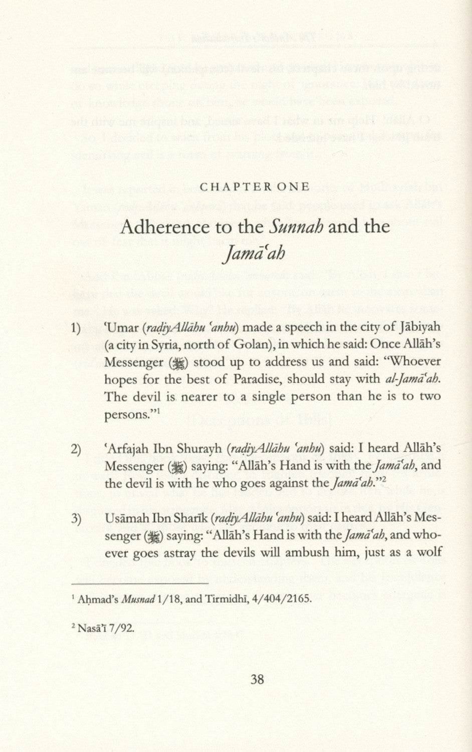 الباب الأول: التمسك بالسنة والجماعة 1) 2) 3) خطب عمر رضي الله عنه بمدينة الجابية (مدينة في الشام، شمال الجولان)، فقال: قام إلينا رسول الله صلى الله عليه وسلم، فقال: "من كان يرجو خير الجنة فليلزم الجماعة، فإن الشيطان أقرب إلى الواحد منه إلى الاثنين". "عن عرفجة بن شريح رضي الله عنه قال: سمعت رسول الله صلى الله عليه وسلم يقول: "يد الله مع الجماعة، والشيطان مع من خالف الجماعة". 2 وعن أسامة بن شريك رضي الله عنه قال: سمعت رسول الله صلى الله عليه وسلم يقول: "يد الله مع الجماعة، ومن ضل تتبناه الشياطين كما يتبناه الذئب". 1 مسند أحمد 1/18، والترمذي 4/404/2165. 2 النسائي 7/92. 38