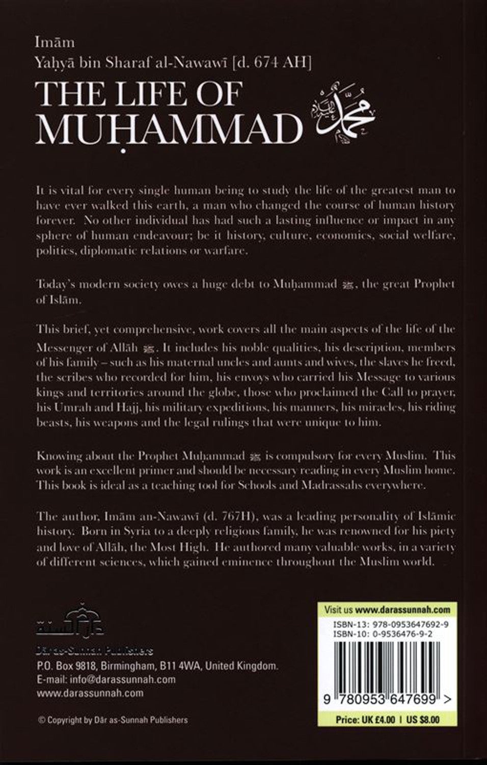 الإمام يحيى بن شرف النووي [ت 674 هـ] حياة محمد صلى الله عليه وسلم. من الضروري لكل إنسان أن يدرس حياة أعظم رجل وطئت قدمه الأرض، الرجل الذي غيّر مجرى التاريخ البشري إلى الأبد. لم يكن لأي فرد آخر مثل هذا التأثير أو الأثر الدائم في أي مجال من مجالات المساعي الإنسانية؛ سواء كان ذلك التاريخ أو الثقافة أو الاقتصاد أو الرعاية الاجتماعية أو السياسة أو العلاقات الدبلوماسية أو الحرب. يدين مجتمعنا الحديث اليوم بدين كبير لمحمد صلى الله عليه وسلم، نبي الإسلام العظيم. يغطي هذا العمل الموجز، والشامل، جميع الجوانب الرئيسية لحياة رسول الله صلى الله عليه وسلم. يتضمن صفاته النبيلة، ووصفه، وأفراد عائلته - مثل أعمامه وخالاته وزوجاته، والعبيد الذين أعتقهم، والكتبة الذين سجلوا له، ورسله الذين حملوا رسالته إلى مختلف الملوك والأقاليم في جميع أنحاء العالم، وأولئك الذين أعلنوا الأذان، وعمرته وحجه، وغزواته، وأخلاقه، ومعجزاته، ودوابه، وأسلحته، والأحكام الشرعية التي كانت فريدة به. إن معرفة النبي محمد صلى الله عليه وسلم إلزامية على كل مسلم. هذا العمل هو تمهيد ممتاز ويجب أن يكون قراءة ضرورية في كل منزل مسلم. هذا الكتاب مثالي كأداة تعليمية للمدارس والمدارس الدينية في كل مكان. كان المؤلف، الإمام النووي (ت 767 هـ)، شخصية رائدة في التاريخ الإسلامي. ولد في سوريا لعائلة متدينة للغاية، وكان مشهورًا بصورته وحبه لله تعالى. ألف العديد من الأعمال القيمة، في مجموعة متنوعة من العلوم المختلفة، والتي اكتسبت شهرة في جميع أنحاء العالم الإسلامي. تفضلوا بزيارتنا على www.darassunnah.com ISBN-13: 978-0953647692-9 ISBN-10: 0-9536476-9-2 دار دار السنة للنشر، صندوق بريد 9818، برمنغهام، B11 4WA، المملكة المتحدة. البريد الإلكتروني: info@darassunnah.com www.darassunnah.com حقوق الطبع والنشر محفوظة لدار السنة للنشر، 9 780953 647699 > السعر: 4.00 جنيه إسترليني / 8.00 دولار أمريكي