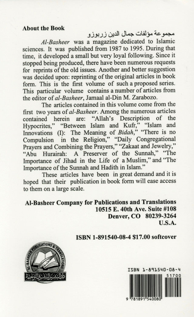 "نحو فهم ديننا - المجلد الأول" لجمال الدين محمد زرابوزو، كتابٌ أساسيٌّ باللغة الإنجليزية لكل من يسعى إلى فهمٍ واضحٍ وأصيلٍ للعقيدة الإسلامية وتطبيقاتها. يجمع هذا المجلد مقالاتٍ رئيسيةً نُشرت أصلاً في مجلة "البشير" (١٩٨٧-١٩٩٥)، موفرًا للقراء مصدرًا موثوقًا به في مواضيع مثل التوحيد، والبدع، وصلاة الجماعة، والتمييز بين الإسلام والكفر.