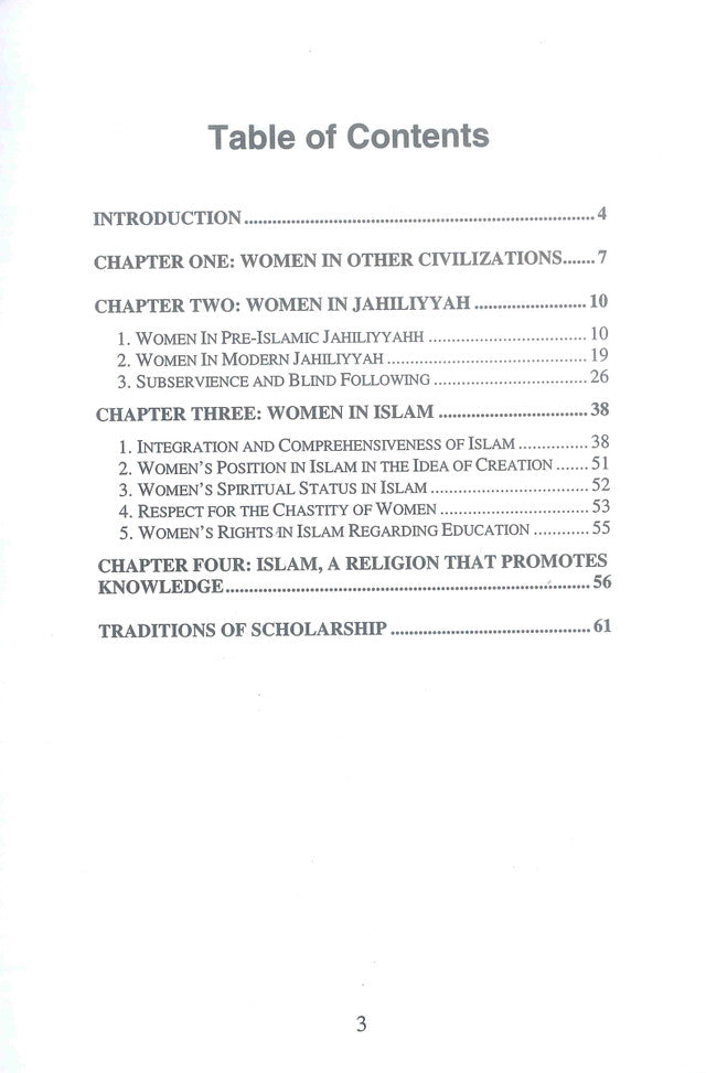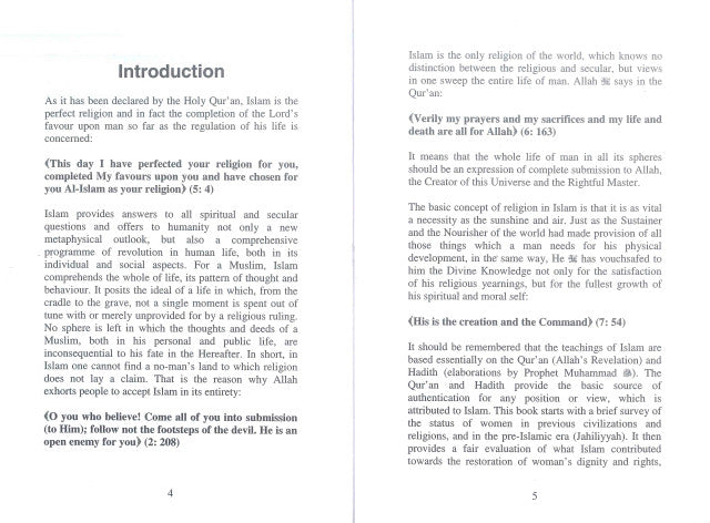 الصفحة: 01 المرأة في الجاهلية والإسلام صرى س د. عمر أحمد النساء BD الجاهليةالصفحة: 02 جدول المحتويات المقدمة.... ................ 4 الفصل الأول: المرأة في الحضارات الأخرى........ 7 الفصل الثاني: المرأة في الجاهلية. 1. المرأة في الجاهلية قبل الإسلام 2. المرأة في الجاهلية الحديثة....... .................... 10 10 19 .26 .38 1. تكامل الإسلام وشموله.......... 38 3. التبعية والاتباع الأعمى. الفصل الثالث: المرأة في الإسلام. 2. مكانة المرأة في الإسلام في فكرة الخلق ........ 51 3. المكانة الروحية للمرأة في الإسلام .... 4. احترام عفة المرأة ..... 5. حقوق المرأة في الإسلام فيما يتعلق بالتعليم الفصل الرابع: الإسلام دين يعزز المعرفة ................................................ تقاليد العلم. 52 .53 .55 .56 .61 3Page:03مقدمة: كما نصّ القرآن الكريم، فإن الإسلام هو الدين الكامل، بل هو إتمام نعمة الله على الإنسان في تنظيم حياته: (الْيَوْمَ أَكْمَلْتُ لَكُمْ دِينَكُمْ وَأَتْمَمْتُ عَلَيْكُمْ نِعْمَتِي وَرَضِيتُ لَكُمْ الْإِسْلاَمَ دِينًا) (المائدة: 4). يُجيب الإسلام على جميع الأسئلة الروحية والدنيوية، ولا يُقدم للبشرية منظورًا ميتافيزيقيًا جديدًا فحسب، بل يُقدم أيضًا برنامجًا شاملًا للتغيير في الحياة البشرية، في جوانبها الفردية والاجتماعية. بالنسبة للمسلم، يُغطي الإسلام الحياة بأكملها، ونمط تفكيرها وسلوكها. إنه يضع نموذجًا للحياة التي لا تُقضى فيها لحظة واحدة، من المهد إلى اللحد، على غير هدى أو مجرد تدبير من قِبل دين. لا يبقى مجالٌ تكون فيه أفكار المسلم وأفعاله، في حياته الشخصية والعامة، غير ذات أهمية لمصيره في الآخرة. باختصار، لا يمكن للمرء أن يجد في الإسلام أرضًا محايدة لا يطالب بها الدين. ولهذا السبب يحث الله الناس على قبول الإسلام برمته: (يا أيها الذين آمنوا تعالوا أسلموا جميعًا ولا تتبعوا خطوات الشيطان إنه لكم عدو مبين) (2:208). الإسلام هو الدين الوحيد في العالم الذي لا يفرق بين الديني والدنيوي، بل ينظر في نظرة واحدة إلى حياة الإنسان بأكملها. يقول الله في القرآن: (إن صلاتي ونسكي ومحياي ومماتي لله) (6:163). وهذا يعني أن حياة الإنسان بأكملها في جميع مجالاتها يجب أن تكون تعبيرًا عن الاستسلام الكامل لله، خالق هذا الكون والسيد الحق. المفهوم الأساسي للدين في الإسلام هو أنه ضرورة حيوية كضرورة الشمس والهواء. وكما أن رب العالمين قد هيأ للإنسان كل ما يحتاجه لنموه الجسدي، فقد وهبه المعرفة الإلهية ليس فقط لإشباع رغباته الدينية، بل أيضًا لنمو ذاته الروحية والأخلاقية على أكمل وجه: (لَهُ الْخَلْقُ وَالأَمْرُ) (الأعراف: 54). تجدر الإشارة إلى أن تعاليم الإسلام تستند أساسًا إلى القرآن الكريم والحديث الشريف. فالقرآن الكريم والحديث الشريف هما المصدر الأساسي للتصديق على أي موقف أو رأي يُنسب إلى الإسلام. يبدأ هذا الكتاب باستعراض موجز لمكانة المرأة في الحضارات والأديان السابقة، وفي الجاهلية. ثم يقدم تقييمًا منصفًا لما ساهم به الإسلام في استعادة كرامة المرأة وحقوقها.