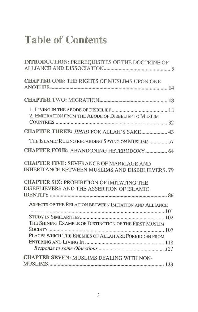 Al-Wala' Wa'l-Bara' Selon la 'Aqeedah des Salaf PARTIE 3 Muhammad Saeed al-Qahtani Al-Firdous Ltd., Londres Table des matières INTRODUCTION : PRÉREQUIS DE LA DOCTRINE D'ALLIANCE ET DE DISSOCIATION............................ 5 CHAPITRE UN : LES DROITS DES MUSULMANS LES UNS SUR LES AUTRES................... CHAPITRE DEUX : MIGRATION..............1. VIVRE DANS LE PAYS DE L'INCROYANCE..2. ÉMIGRATION DU PAYS DE L'INCROYANCE VERS LES PAYS MUSULMANS14181832 CHAPITRE TROIS : LE JIHAD POUR L'AMOUR D'ALLAH..................43. LA RÈGLE ISLAMIQUE CONCERNANT L'ESPIONNAGE DES MUSULMANS................57 CHAPITRE QUATRE : L'ABANDONNEMENT DE L'HÉTÉRODOXIE................64 CHAPITRE CINQ : LA RUPTURE DU MARIAGE ET DE L'HÉRITAGE ENTRE MUSULMANS ET NON-CROYANTS. 79 CHAPITRE SIX : L'INTERDICTION D'IMITER LES NON-CROYANTS ET L'AFFIRMATION DE L'IDENTITÉ ISLAMIQUE......... 86 ASPECTS DE LA RELATION ENTRE IMITATION ET ALLIANCE. 101 ÉTUDE DES SIMILITUDES...... 102 L'EXEMPLE BRILLANT DE LA DISTINCTION DE LA PREMIÈRE SOCIÉTÉ MUSULMANE........ 107 LIEUX OÙ IL EST INTERDIT AUX ENNEMIS D'ALLAH D'ENTRER ET DE VIVRE..........118121 Réponse à quelques objections. CHAPITRE SEPT : LES RELATIONS DES MUSULMANS AVEC LES NON-MUSULMANS..........c'est l'eau fraîche et limpide à laquelle ils se désaltèrent tous. Puis Allah a orienté leur amour les uns vers les autres et l'a fait les lier les uns aux autres, comme l'a dit le Prophète : « Chacun est avec celui qu'il aime. » 8 Abdullah Ibn Masu'd a dit : « Un homme vint trouver le Messager d'Allah et dit : « Ô Messager d'Allah ! Que dis-tu de l'homme qui aime certaines personnes mais ne peut suivre leur rythme en matière de bonnes actions ? » Le Messager d'Allah répondit : « Chacun sera avec ceux qu'il aime. » Anas a rapporté qu'un homme vint un jour interroger le Prophète (que la paix et les bénédictions soient sur lui) au sujet de l'Heure. Le Prophète lui demanda : « Qu'as-tu proposé pour elle ? » L'homme répondit : « Je n'ai pas accompli beaucoup de prières, je n'ai pas beaucoup jeûné ni fait l'aumône, mais j'aime Allah et Son Messager. » Le Prophète lui dit alors : « Tu es avec ceux que tu aimes. »¹⁰ Il convient de préciser ici que cet amour ne doit pas être compris comme une sorte de pouvoir mystique ou sublime capable d'effacer le péché et l'iniquité, comme certains l'ont cru à tort. Il s'agit plutôt d'un amour sincère qui se traduit en actes. Allah a dit : « Cela ne sera conforme ni à vos désirs (ô musulmans), ni à ceux des Gens du Livre. Quiconque commet un mauvais acte… » (Sahih al-Bukhari, Kitab al-Adab, vol. 10/557, hadith 6168 ; Sahih al-Bukhari, Kitab al-Adab, vol. 10/557, hadith 6169). et « Sahih Muslim », Kitab al-Birr, vol. 4/2034, hadith 2640.10 « Sahih al-Bukhari », Kitab al-Adab, vol. 10/557, hadith 6171, et « Sahih Muslim », Kitab al-Birr, vol. 4/2032, hadith 2639. À propos de cet ouvrage : Ce livre a été initialement présenté sous forme de mémoire de maîtrise au département d’Aqida de l’université Umm al-Qorah de La Mecque, en Arabie saoudite. Le jury était composé de : Muhammad Qutb, directeur de recherche, en tant que président ; Cheikh Abdar-Razak 'Afifi, en tant que membre ; et le Dr Abdal-Aziz Obeid, en tant que membre. L’auteur a obtenu sa maîtrise avec mention très bien le samedi 4 Shaban 1401 au soir. Il est impossible d’en fournir une traduction littérale en anglais. Les mots « al-wala' wa'l-bara' » signifient, d'une part, se rapprocher de ce qui plaît à Allah et à Son Messager et, d'autre part, s'éloigner de ce qui déplaît à Allah et à Son Messager (que la paix et la bénédiction d'Allah soient sur lui). Al-Firdous Ltd., Londres, 9 781874 263388