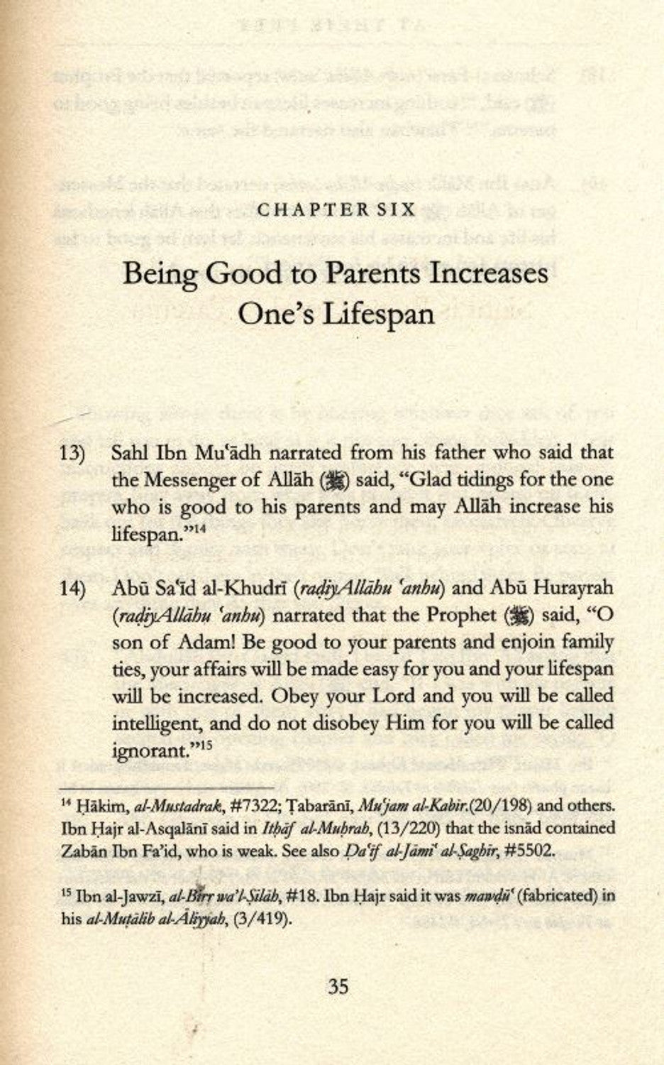 CHAPITRE SIX Bien traiter ses parents augmente la durée de vie 13) Sahl Ibn Mu'adh a rapporté de son père que le Messager d'Allah (que la paix et les bénédictions soient sur lui) a dit : « Bonne nouvelle pour celui qui est bon envers ses parents et qu'Allah augmente sa durée de vie. » 2214 14) Abu Sa'id al-Khudri (qu'Allah les agrée) et Abu Hurayrah (qu'Allah les agrée) ont rapporté que le Prophète (que la paix et les bénédictions soient sur lui) a dit : « Ô fils d'Adam ! Sois bon envers tes parents et encourage les liens familiaux, tes affaires te seront facilitées et ta durée de vie sera augmentée. Obéissez à votre Seigneur et vous serez appelés intelligents, et ne Lui désobéissez pas, car vous serez appelés ignorants. >>15 14 Hakim, al-Mustadrak, n° 7322 ; Tabarani, Mu'jam al-Kabir (20/198) et autres. Ibn Hajr al-Asqalani a dit dans Ithaf al-Mubrab (13/220) que l'isnad contenait Zaban Ibn Fa'id, qui est faible. Voir aussi Da'if al-Jami' al-Saghir, n° 5502. 15 Ibn al-Jawzi, al-Birr wa'l-Şilab, n° 18. Ibn Hajr a dit qu'il était mandi' (fabriqué) dans son al-Mutalib al-Aliyyah (3/419). 35 35