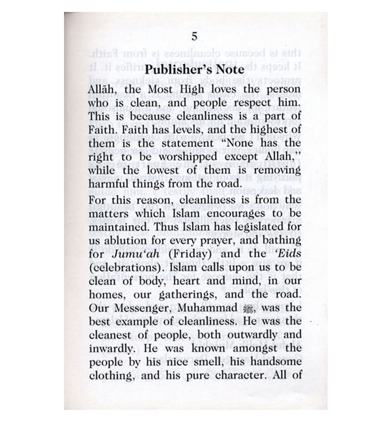 C’est pourquoi l’Islam encourage la propreté. Il a ainsi prescrit les ablutions pour chaque prière et le bain rituel pour le vendredi (Jumu’ah) et les fêtes de l’Aïd. L’Islam nous appelle à la pureté du corps, du cœur et de l’esprit, chez nous, lors de nos rassemblements et sur la route. Notre Messager, Muhammad, était l’exemple même de la pureté. Il était d’une pureté exemplaire, tant extérieurement qu’intérieurement. Il était connu de tous pour son agréable odeur, ses beaux vêtements et sa pureté de caractère.