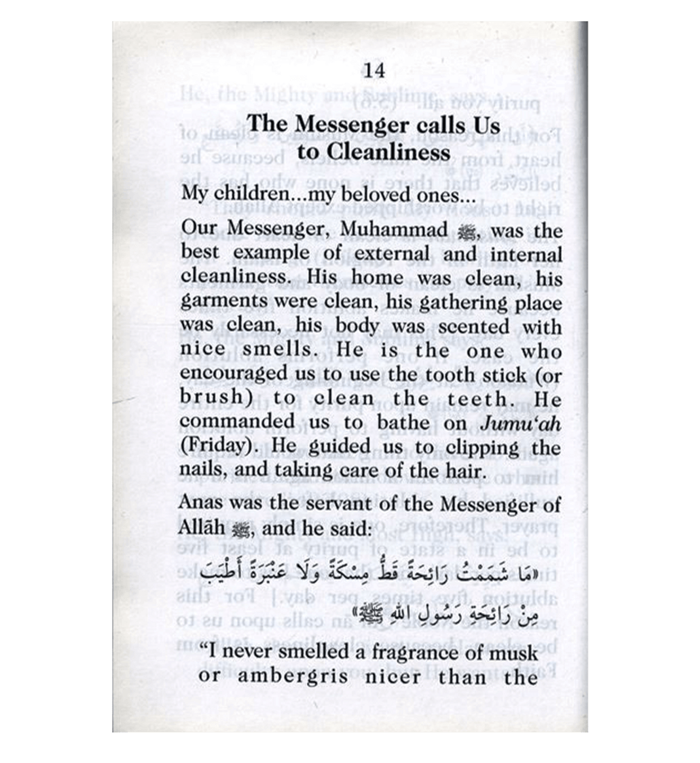 801 Notre Messager, Muhammad, était le meilleur exemple de propreté extérieure et intérieure. Sa maison était propre, ses vêtements étaient propres, son lieu de rassemblement était propre, son corps était agréablement parfumé. C'est lui qui nous a encouragés à utiliser le bâtonnet (ou la brosse à dents) pour nous nettoyer les dents. Il nous a ordonné de nous baigner le vendredi (Jumu'ah). Il nous a guidés pour nous couper les ongles et prendre soin de nos cheveux. Anas était le serviteur du Messager d'Allah, et il a dit :