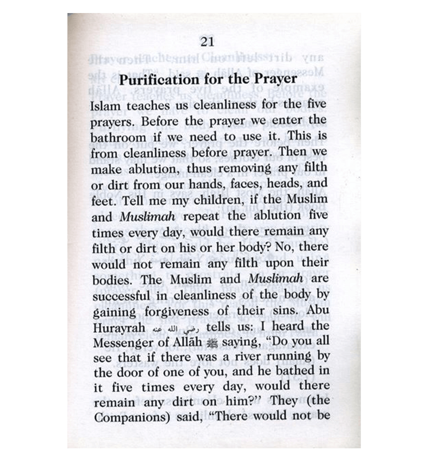 L'islam nous enseigne la pureté rituelle pour les cinq prières quotidiennes. Avant la prière, nous allons aux toilettes si nécessaire. Cela fait partie des ablutions rituelles. Ensuite, nous faisons nos ablutions, nous débarrassant ainsi de toute impureté de nos mains, de notre visage, de notre tête et de nos pieds. Mes enfants, dites-moi, si un musulman ou une musulmane répète les ablutions cinq fois par jour, resterait-il de la moindre impureté sur son corps ? Non, il ne resterait aucune impureté. Le musulman et la musulmane réussissent dans la pureté de leur corps en obtenant le pardon de leurs péchés. Abou Hourayra rapporte : J'ai entendu le Messager d'Allah dire : « Voyez-vous tous si une rivière coulait près de la porte de l'un d'entre vous, et qu'il s'y baignait cinq fois par jour, resterait-il de la moindre impureté sur lui ? » Ils (les Compagnons) répondirent : « Il n'y en aurait pas. »