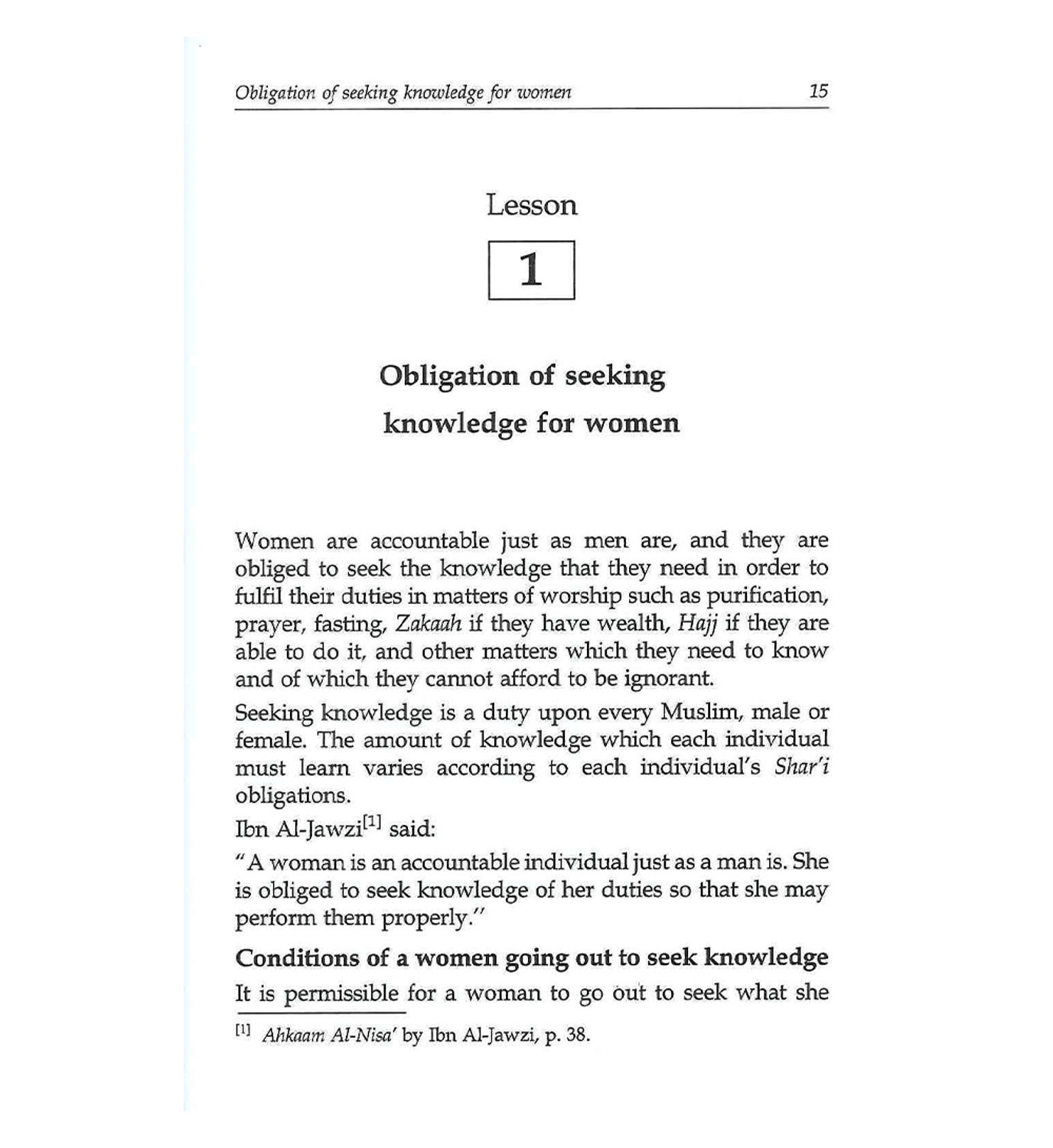 Les femmes sont tout aussi responsables que les hommes et elles sont tenues de rechercher les connaissances nécessaires pour accomplir leurs devoirs en matière de culte, tels que la purification, la prière, le jeûne, la Zakat si elles en ont les moyens, le Hajj si elles en ont les moyens, et autres sujets qu'elles doivent connaître et dont elles ne peuvent se permettre d'ignorer l'existence.