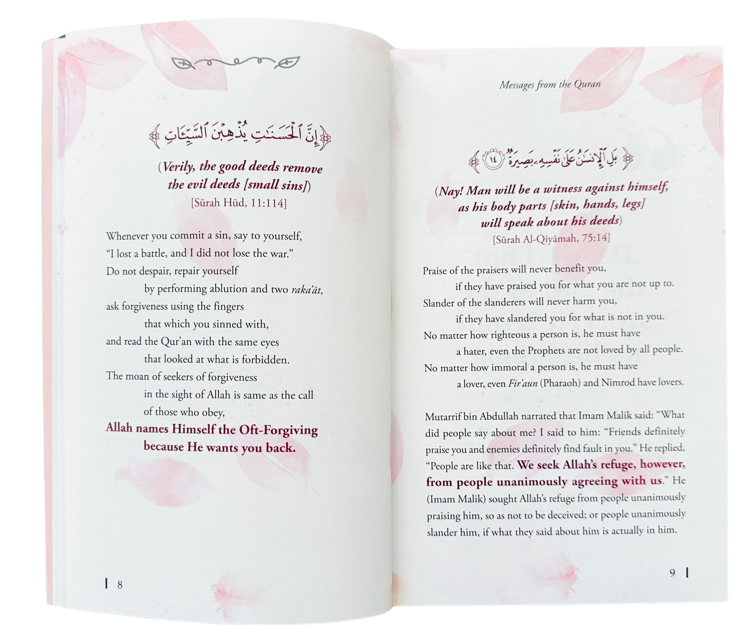Messages du Coran (En vérité, les bonnes actions effacent les mauvaises [petits péchés]) [Sourate Al-Hud, 11:114]. Lorsque vous commettez un péché, dites-vous : « J'ai perdu une bataille, mais je n'ai pas perdu la guerre. » Ne désespérez pas, purifiez-vous en accomplissant vos ablutions et deux rak'ahs, implorez le pardon en utilisant les doigts avec lesquels vous avez péché, et lisez le Coran avec les mêmes yeux qui ont contemplé ce qui était interdit. La plainte de ceux qui implorent le pardon auprès d'Allah est semblable à l'appel de ceux qui obéissent. Allah se nomme Lui-même le Très-Pardonneur car Il désire votre retour. 4 12 29, بَلِ الْإِنسَنُ عَلَى نَفْسِهِ بَصِيرَةُ (Non ! L'homme témoignera contre lui-même, car ses parties du corps [peau, mains, jambes] parleront de ses actes) [Sourate Al-Qiyamah, 75:14]. Les louanges des louangeurs ne vous seront d'aucun profit s'ils vous louent pour ce que vous n'avez pas fait. Les calomnies des calomniateurs ne vous nuiront d'aucun mal s'ils vous calomnient pour ce qui n'est pas en vous. Quelle que soit la piété d'une personne, elle aura toujours des détracteurs ; même les Prophètes ne sont pas aimés de tous. Quelle que soit la moralité d'une personne, elle a forcément un amant, même Pharaon et Nimrod en avaient. Mutarrif ibn Abdullah a rapporté que l'imam Malik a dit : « Que disaient les gens de moi ? » Je lui ai répondu : « Tes amis te louent et tes ennemis te critiquent. » Il a répliqué : « C'est ainsi que vont les gens. Nous implorons la protection d'Allah contre ceux qui approuvent unanimement nos propos. » Il (l'imam Malik) implorait la protection d'Allah contre ceux qui le louaient unanimement, afin de ne pas être trompé ; ou contre ceux qui le calomniaient unanimement, si ce qu'ils disaient de lui était vrai.