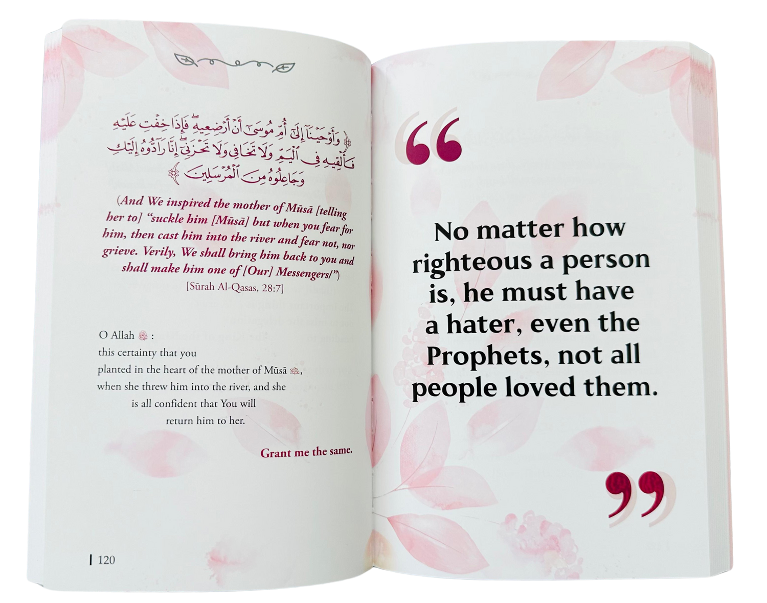 وَأَوْحَيْنَا إِلَى أُمِ مُوسَى أَنْ أَرْضِعِيهِ فَإِذَا خِفْتِ عَلَيْهِ تألقِيهِ فِي الْيَمِّ وَلَا تَخَافِي وَلَا تَحْزَنِي Ô Allah, cette certitude que Tu as semée dans le cœur de la mère de Moïse lorsqu'elle l'a jeté dans le fleuve, et elle est pleinement confiante que Tu le lui rendras. Accorde-moi la même chose. 66 Quel que soit le juste, il aura forcément des ennemis, même les prophètes, car tous ne les aimaient pas. 99 | 120