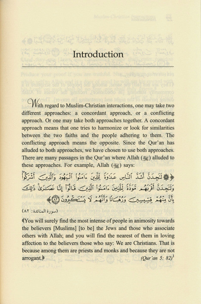 Il existe différentes approches : une approche concordante et une approche conflictuelle. On peut aussi combiner les deux. L’approche concordante vise à harmoniser les deux religions et leurs adeptes, ou à rechercher leurs similitudes. L’approche conflictuelle, quant à elle, s’y oppose. Le Coran faisant allusion aux deux approches, nous avons choisi de les utiliser toutes deux. De nombreux passages du Coran font référence à ces approches. Par exemple, Allah (3) dit :