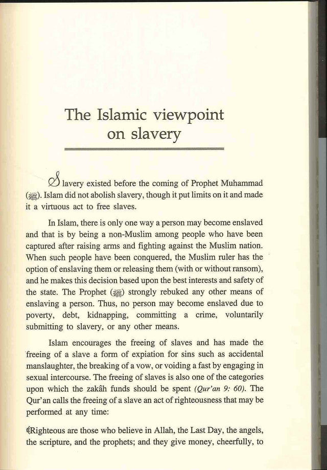 En Islam, l'esclavage ne peut être instauré que pour les non-musulmans faisant partie des populations capturées après avoir pris les armes et combattu la nation musulmane. Une fois ces populations conquises, le souverain musulman a le choix de les réduire en esclavage ou de les libérer (avec ou sans rançon), prenant cette décision en fonction de l'intérêt supérieur et de la sécurité de l'État. Le Prophète (3) a fermement condamné tout autre moyen d'asservir une personne. Ainsi, nul ne peut être réduit en esclavage pour cause de pauvreté, de dettes, d'enlèvement, de crime, de soumission volontaire à l'esclavage, ou pour tout autre motif.