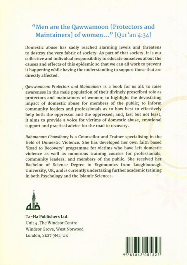 Qawwamoon : Protecteurs et Soutiens est un livre qui s'adresse à nous tous : il vise à sensibiliser les hommes à leur rôle divinement prescrit de protecteurs et de soutiens des femmes ; à mettre en lumière l'impact dévastateur des violences conjugales sur le grand public ; à informer les responsables communautaires et les professionnels sur la meilleure façon d'aider efficacement à la fois l'oppresseur et l'opprimé ; et, enfin et surtout, il vise à donner une voix aux victimes de violences conjugales, un soutien émotionnel et des conseils pratiques pour le chemin du rétablissement.