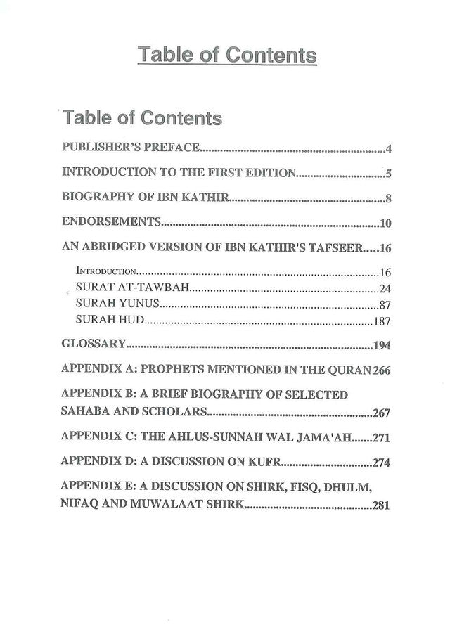 Page:01 تفت القرار العظيم TAFSIR IBN KATHIR PANET 111 Sourate At-Tawbah, ayat 91 à 129 Sourate Yunus, ayat 1 à 109 Sourate Hūd, ayat 1 à 5 ABRÉGÉ PAR Cheikh Muhammad Nasib Ar-Rafa'i Al-Firdous Ltd., LondresPage:02 TAFSIR IBN KATHIR الفردوس AL-FIRDOUS Al-Firdous Ltd., Londres ISBN 1-874263-83-3 9 781874 263838Page:03 Table des matières Table des matières PRÉFACE DE L'ÉDITEUR.................... INTRODUCTION À LA PREMIÈRE ÉDITION........................ BIOGRAPHIE D'IBN KATHIR... APPROBATIONS........ ...............10 UNE VERSION ABRÉGÉE DU TAFSEER D'IBN KATHIR.....16 INTRODUCTION..... SOURATE AT-TAWBAH... SOURATE YUNUS....... SOURATE HUD. GLOSSAIRE. .............. ............... ............16 ..24 ..87 .187 194 ANNEXE A : LES PROPHÈTES MENTIONNÉS DANS LE CORAN 266 ANNEXE B : UNE BRÈVE BIOGRAPHIE DE COMPAGNONS ET DE SAVANTS SÉLECTIONNÉS........................... ..............267 ANNEXE C : LES AHLUS-SUNNAH WAL JAMA'AH.......271 ANNEXE D : UNE DISCUSSION SUR LA KUFR.................................274 ANNEXE E : UNE DISCUSSION SUR LE SHIRK, LE FISQ, LE DHULM, LE NIFAQ ET LE MUWALAAT SHIRK............. ................281Page :04 Citant Ibn Abbas, Al-Bazzar a rapporté : « Interrogé sur les Awliaa d'Allah, le Prophète a répondu : « Ce sont ceux qui vous rappellent Allah lorsque vous les voyez. » » Citant Abu Huraira, Ibn Jarir a rapporté : « Il y a parmi les serviteurs d'Allah des prophètes, et ceux qui sont morts dans le « La cause d’Allah, l’envie. » « Qui sont-ils, demanda-t-on, afin que nous puissions les aimer ? » Le Prophète répondit : « Ce sont des gens qui s’aiment pour l’amour d’Allah, et non pour les richesses ou les liens du sang. Leurs visages rayonnent de lumière ; ils sont sur des chaires de lumière. Ils ne craignent pas quand les autres craignent, et ne s’affligent pas quand les autres s’affligent. » Lorsque le Prophète eut fini de les décrire, il récita : « En vérité, pour les Awliaa d’Allah, aucune crainte ne les atteindra et ils ne s’affligeront pas. » Ce hadith a également été rapporté par Abou Daoud, d’après Omar Ibn Al-Khattab, selon une chaîne de transmission solide. Citant 'Ubada Ibn As-Samit, l’imam Ahmad a rapporté : « J’ai demandé au Prophète : Ô Messager d’Allah ! Que signifie le verset : “Pour eux, il y a de bonnes nouvelles, dans la vie présente et dans l’au-delà” ? » Le Prophète répondit : « Tu m'as posé une question qu'aucun des miens ne m'a jamais posée auparavant : il s'agit d'une bonne vision, qu'un homme a pendant son sommeil ou qu'une autre personne a à son sujet. » Abdullah Ibn As-Samit rapporta qu'Abu Dharr avait dit : « Ô Messager d'Allah ! L'homme accomplit une action, et les gens louent ceux qui croient en l'Unicité d'Allah, qui Le craignent et L'aiment. » 149