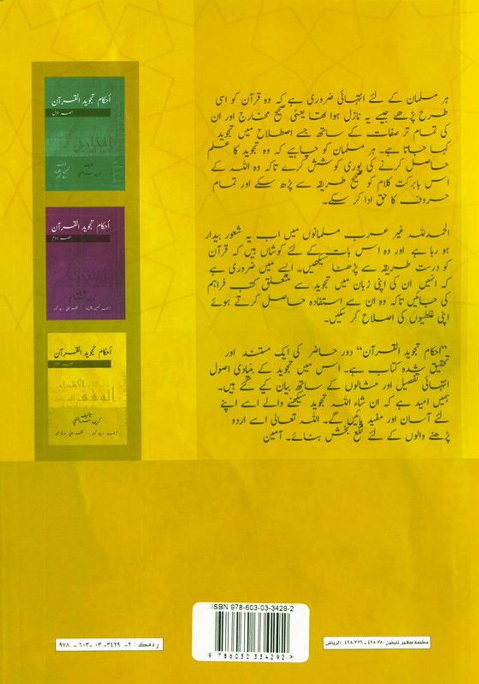 Le troisième volume du livre « Règles de Tajwid du Coran » (en ourdou) est un guide essentiel pour les étudiants et les lecteurs désireux de perfectionner leur récitation du Coran selon les principes du Tajwid. Rédigé en ourdou clair et accessible, cet ouvrage explique les règles avancées de prononciation, d'articulation et de récitation à l'aide d'exemples tirés du Noble Coran. Il s'appuie sur les connaissances fondamentales acquises dans les parties 1 et 2, aidant ainsi les apprenants à améliorer leur précision, leur fluidité et leur compréhension de la récitation coranique. Ce livre est idéal pour les étudiants, les enseignants et tous ceux qui souhaitent lire le Coran avec beauté et exactitude, conformément aux principes classiques du Tajwid.