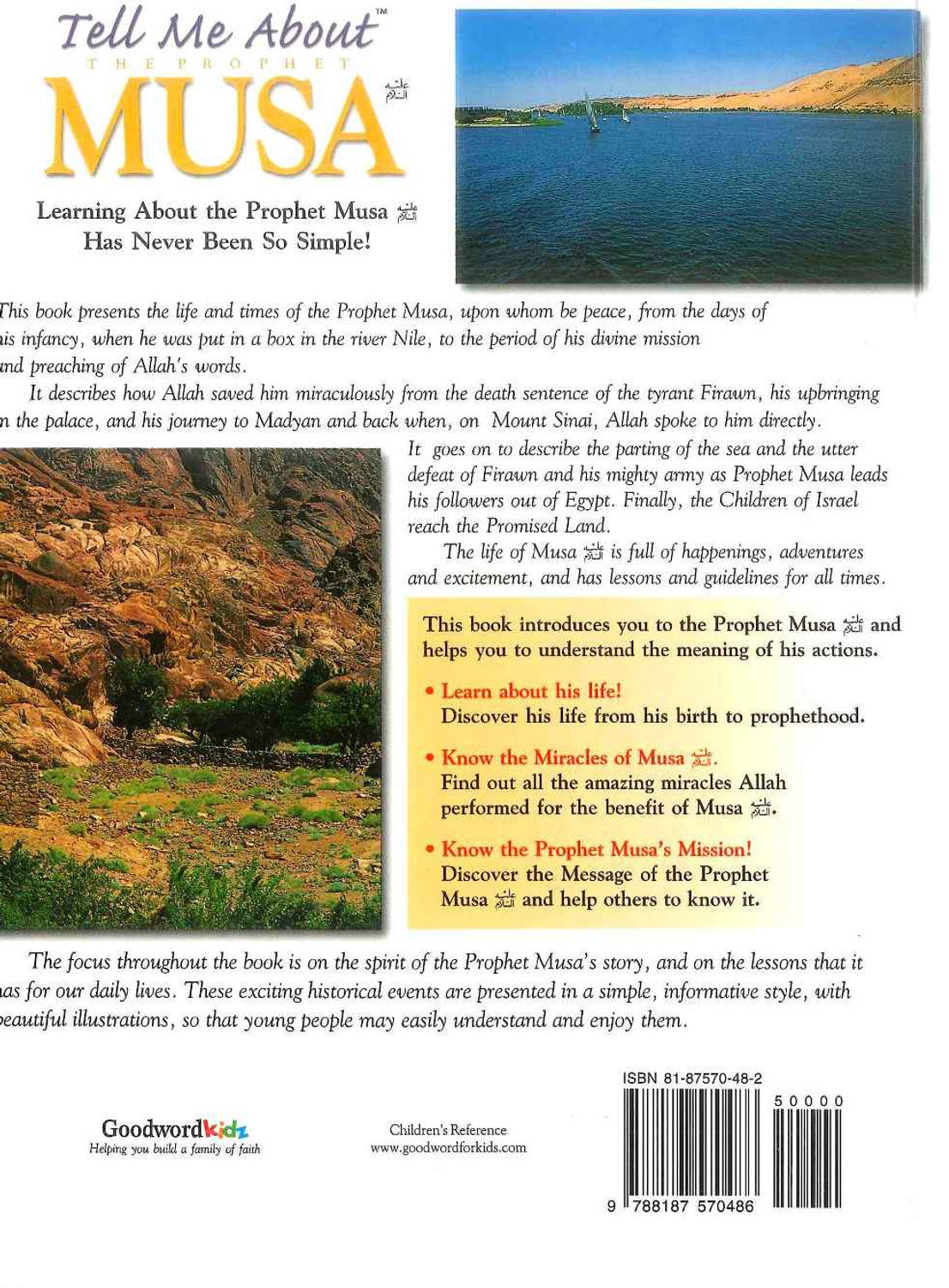 Ce livre retrace la vie et l'époque du Prophète Moïse (que la paix et le salut soient sur lui), depuis son enfance, lorsqu'il fut placé dans un panier sur le Nil, jusqu'à sa mission divine et la prédication de la parole d'Allah. Il décrit comment Allah le sauva miraculeusement de la condamnation à mort prononcée par le tyran Pharaon, son éducation au palais et son voyage aller-retour à Madian, au mont Sinaï, où Allah lui parla directement. Il relate ensuite le passage de la mer Rouge et la défaite totale de Pharaon et de sa puissante armée, tandis que le Prophète Moïse (que la paix et le salut soient sur lui) conduit ses fidèles hors d'Égypte. Enfin, les Enfants d'Israël atteignent la Terre promise. La vie de Moïse est riche en événements, en aventures et en moments palpitants, et recèle des enseignements et des préceptes valables pour tous les temps. Tout au long de l'ouvrage, l'accent est mis sur l'esprit du récit du prophète Moïse (que la paix soit sur lui) et sur les enseignements qu'il recèle pour notre vie quotidienne. Ces événements historiques passionnants sont présentés dans un style simple et instructif, agrémenté de magnifiques illustrations, afin que les jeunes puissent les comprendre et les apprécier facilement.