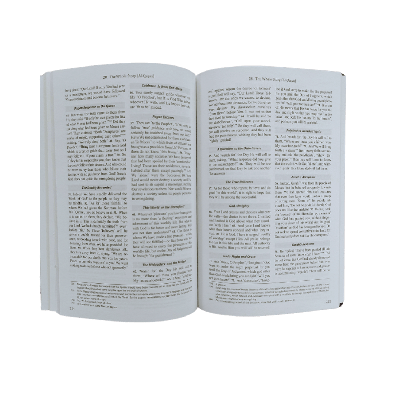 Réponse païenne au Coran 4. Mais lorsque la vérité leur parvint de Notre part, ils dirent : « Si seulement on lui avait donné la même chose qu’à Moïse ! » N’ont-ils pas nié ce qui avait été donné à Moïse auparavant ? Ils prétendirent : « Les deux Écritures sont des œuvres de magie, se confirmant mutuellement. » Ajoutant : « Nous les nions toutes deux. » 49. Dis : « Ô Prophète, apportez-leur une Écriture de Dieu. »