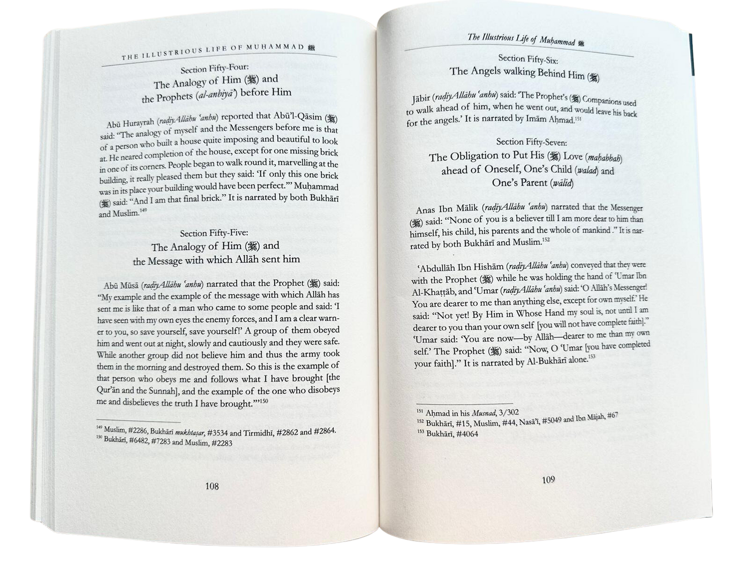 LA VIE ILLUSTRÉE DE MUHAMMAD Section cinquante-quatre : L'analogie entre Lui (que la paix et les bénédictions soient sur lui) et les Prophètes (al-anbiya') qui l'ont précédé. Abou Hourayra (qu'Allah l'agrée) a rapporté qu'Abou al-Qasim (que la paix et les bénédictions soient sur lui) a dit : « L'analogie entre moi et les Messagers qui m'ont précédé est celle d'un homme qui a construit une maison imposante et magnifique. Il était presque à la fin de la construction, à l'exception d'une brique manquante dans un angle. Les gens se mirent à en faire le tour, émerveillés par l'édifice, qui leur plaisait beaucoup, mais ils disaient : « Si seulement cette brique était à sa place, votre maison serait parfaite. » Muhammad (que la paix et les bénédictions soient sur lui) dit : « Et je suis cette dernière brique. » Ce récit est rapporté à la fois par Bukhari et Muslim.149 Section cinquante-cinq : L'analogie de Lui () et le message avec lequel Allah l'a envoyé. Abou Moussa (qu'Allah l'agrée) a rapporté que le Prophète () a dit : « Mon exemple et l'exemple du message avec lequel Allah m'a envoyé sont semblables à ceux d'un homme qui est venu vers un peuple et a dit : « J'ai vu de mes propres yeux les forces ennemies, et je suis un avertisseur clair pour vous, alors sauvez-vous, sauvez-vous ! » Un groupe d'entre eux lui obéit et sortit de nuit, lentement et prudemment, et ils furent sains et saufs. Un autre groupe, en revanche, ne crut pas en lui et l'armée les captura au matin et les extermina. Tel est l'exemple de celui qui m'obéit et suit ce que j'ai apporté [le Coran et la Sunna], et l'exemple de celui qui me désobéit et ne croit pas à la vérité que j'ai apportée. »<sup>150</sup><sup>19</sup> Muslim, n° 2286, Bukhari mukhtaşar, n° 3534 et Tirmidhi, n° 2862 et 2864. <sup>150</sup> Bukhari, n° 6482, n° 7283 et Muslim, n° 2283. La Vie Illustre de Muhammad, Section Cinquante-Six : Les Anges qui le suivaient. Jabir (qu'Allah l'agrée) a dit : « Les Compagnons du Prophète (que la paix et les bénédictions soient sur lui) marchaient devant lui lorsqu'il sortait, laissant son dos aux anges. » D'après l'imam Ahmad.151 Section cinquante-sept : L'obligation de placer Son amour (mahabbah) avant soi-même, son enfant (walad) et son parent (walid). Anas Ibn Malik (qu'Allah l'agrée) a rapporté que le Messager (que la paix et le salut soient sur lui) a dit : « Nul d'entre vous n'est croyant tant que Je ne lui suis pas plus cher que lui-même, son enfant, ses parents et l'humanité entière. » Ce hadith est rapporté par Bukhari et Muslim.152 'Abdullah Ibn Hisham (qu'Allah l'agrée) a rapporté qu'ils étaient avec le Prophète (que la paix et le salut soient sur lui) lorsqu'il tenait la main d'Umar Ibn Al-Khattab, et Umar (qu'Allah l'agrée) dit : « Ô Messager d'Allah ! Tu m'es plus cher que tout, sauf moi-même. » Il répondit : « Pas encore ! » Par Celui qui tient mon âme entre Ses mains, tu n'auras la foi complète que lorsque je te serai plus cher que toi-même. 'Umar répondit : « Par Allah, tu m'es maintenant plus cher que moi-même. » Le Prophète (que la paix et les bénédictions soient sur lui) dit : « Maintenant, ô 'Umar, ta foi est complète. » Ce hadith est rapporté uniquement par Al-Bukhari.<sup>153</sup><sup>151</sup> Ahmad dans son Musnad, 3/302.<sup>152</sup> Bukhari, n° 15, Muslim, n° 44, Nasa', n° 5049 et Ibn Majah, n° 67.<sup>153</sup> Bukhari, n° 4064.<sup>108</sup><sup>109</sup>