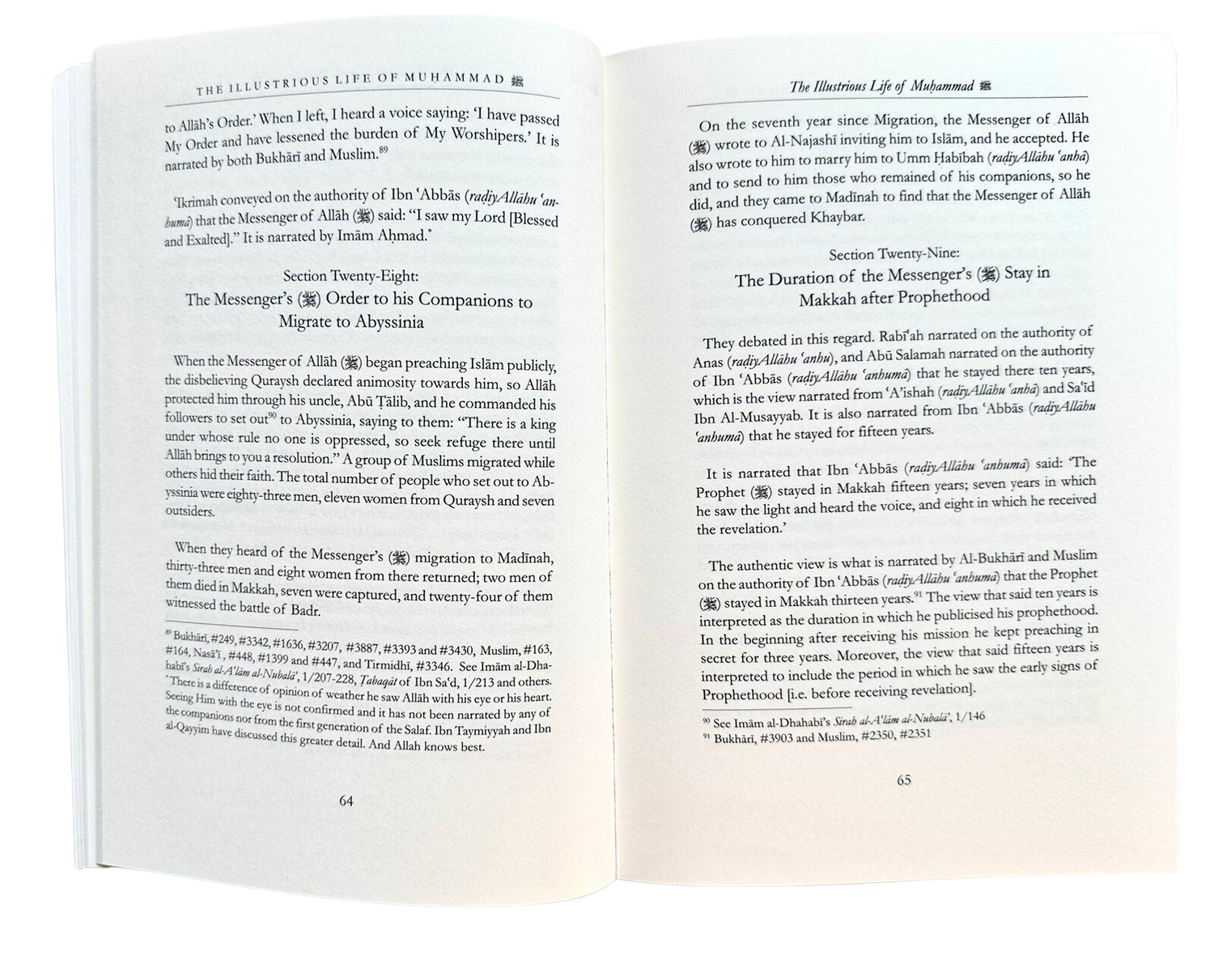 LA VIE ILLUSTRÉE DE MUHAMMAD selon l'Ordre d'Allah. Lorsque je suis parti, j'ai entendu une voix dire : « J'ai transmis Mon Ordre et j'ai allégé le fardeau de Mes Adorateurs. » Il est rapporté par Bukhari et Muslim, 89 Ikrimah transmis d'après Ibn 'Abbas (radiy Allahu 'an- buma) que le Messager d'Allah () a dit : « J'ai vu mon Seigneur [Béni et Exalté]. » Rapporté par l'imam Ahmad. Section vingt-huit : L'ordre du Messager (paix et bénédictions sur lui) à ses Compagnons d'émigrer en Abyssinie. Lorsque le Messager d'Allah (paix et bénédictions sur lui) commença à prêcher publiquement l'islam, les Qurayshites mécréants lui manifestèrent leur hostilité. Allah le protégea alors par l'intermédiaire de son oncle, Abou Talib, et il ordonna à ses fidèles de se rendre en Abyssinie, leur disant : « Il y a un roi sous le règne duquel personne n'est opprimé ; cherchez-y refuge jusqu'à ce qu'Allah vous apporte une solution. » Un groupe de musulmans émigra tandis que d'autres dissimulèrent leur foi. Au total, quatre-vingt-trois hommes, onze femmes Qurayshites et sept étrangers partirent pour l'Abyssinie. Apprenant l'émigration du Messager (paix et bénédictions sur lui) à Médine, trente-trois hommes et huit femmes revinrent de là ; deux hommes moururent à La Mecque, sept furent capturés et vingt-quatre assistèrent à la bataille de Badr. (Boukhari, n° 249, n° 3342) N° 1636, 3207, 3887, 3393 et 3430 ; Muslim, n° 163 et 164 ; Nasa', n° 448, 1399 et 447 ; et Tirmidhi, n° 3346. Voir également la Sirah al-A'lam al-Nubala' de l'imam al-Dhahabi, 1/207-228, les Tabaqat d'Ibn Sa'd, 1/213, et d'autres sources. « Il existe une divergence d'opinions quant à savoir s'il a vu Allah avec ses yeux ou avec son cœur. Le fait qu'il L'ait vu avec les yeux n'est pas confirmé et n'a été rapporté par aucun des Compagnons ni par la première génération des Salaf. Ibn Taymiyyah et Ibn al-Qayyim ont traité ce sujet plus en détail. Et Allah est le plus savant. » La vie illustre de Muhammad. La septième année après l'Hégire, le Messager d'Allah (que la paix et les bénédictions soient sur lui) écrivit à Al-Najashi pour l'inviter à l'Islam, ce qu'il accepta. Il lui demanda également de le marier à Umm Habibah (qu'Allah l'agrée) et de lui envoyer ceux qui restaient de ses compagnons. Al-Najashi s'exécuta et ils arrivèrent à Médine où ils découvrirent que le Messager d'Allah (que la paix et les bénédictions soient sur lui) avait conquis Khaybar. Section vingt-neuf : La durée du séjour du Messager (que la paix et les bénédictions soient sur lui) à La Mecque après la Prophétie. Ils débattirent à ce sujet. Rabi'ah rapporta d'après Anas (qu'Allah l'agrée), et Abu Salamah rapporta d'après Ibn 'Abbas (qu'Allah l'agrée) qu'il y séjourna dix ans, ce qui est l'avis rapporté d'après 'A'ishah (qu'Allah l'agrée) et Sa'id Ibn Al-Musayyab. Il est également rapporté d'après Ibn 'Abbas (qu'Allah l'agrée) Il est rapporté qu'Ibn 'Abbas (qu'Allah l'agrée) a dit : « Le Prophète (que la paix et les bénédictions soient sur lui) est resté à La Mecque quinze ans ; sept ans durant lesquels il a vu la lumière et entendu la voix, et huit ans durant lesquels il a reçu la révélation. » L'avis authentique est celui rapporté par Al-Bukhari et Muslim d'après Ibn 'Abbas (qu'Allah l'agrée), selon lequel le Prophète (que la paix et les bénédictions soient sur lui) est resté à La Mecque treize ans. L'avis qui mentionne dix ans est interprété comme la durée pendant laquelle il a annoncé publiquement sa prophétie. Au début, après avoir reçu sa mission, il a continué à prêcher en secret pendant trois ans. De plus, l'avis qui mentionne quinze ans est interprété comme incluant la période durant laquelle il a perçu les premiers signes de la prophétie [c'est-à-dire avant de recevoir la révélation]. 90 Voir Sirab al-A'lam al-Nubala' de l'imam al-Dhahabi, 1/146 91 Bukhari, n° 3903 et Muslim, n° 2350. #2351 64 65