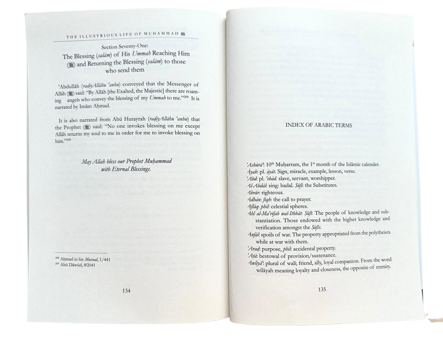 LA VIE ILLUSTRÉE DE MUHAMMAD Section soixante-et-onze : La bénédiction (salam) de sa communauté lui parvient (*) et la restitution de cette bénédiction (salam) à ceux qui la transmettent. 'Abdullah (qu'Allah l'agrée) a rapporté que le Messager d'Allah (que la paix et le salut soient sur lui) a dit : « Par Allah [le Très-Haut, le Majestueux], il y a des anges errants qui me transmettent la bénédiction de ma communauté. »208 Ce récit est rapporté par l'imam Ahmad. Il est également rapporté d'après Abu Hurayrah (qu'Allah l'agrée) que le Prophète (que la paix et le salut soient sur lui) a dit : « Nul ne m'invoque sans qu'Allah ne me rende mon âme afin que je puisse l'invoquer. »209 Qu'Allah accorde à notre Prophète Muhammad ses Bénédictions éternelles. 208 Ahmad dans son Musnad, 1/441 209 Abu Dawud, n° 2041 134 INDEX DES TERMES ARABES 'Ashura : 10 Muharram, le 1er mois du calendrier islamique. Ayah. pl. ayat. Signe, miracle, exemple, leçon, verset. 'Abd : pl. 'ebad. Esclave, serviteur, adorateur. Al-Abdal : sing. badal. Soufi : les Substituts. Abrar : vertueux. Adhan : fiqh : l'appel à la prière. Aflaq : phil. : sphères célestes. Ahl al-Ma'rifah wal-Ithbat. Suft : les gens de science et de justification. Ceux qui, parmi les soufis, possèdent la connaissance et la vérification supérieures. Anfal : butin de guerre. Les biens confisqués aux polythéistes lors de la guerre contre eux. Arad : but, phil. : propriété accidentelle. Ata : don de provisions/subsistance. Awliya' : pluriel de wali ; ami, allié, compagnon fidèle. Dérivé du mot wilayah, qui signifie loyauté et proximité, l'opposé d'inimitié. 135