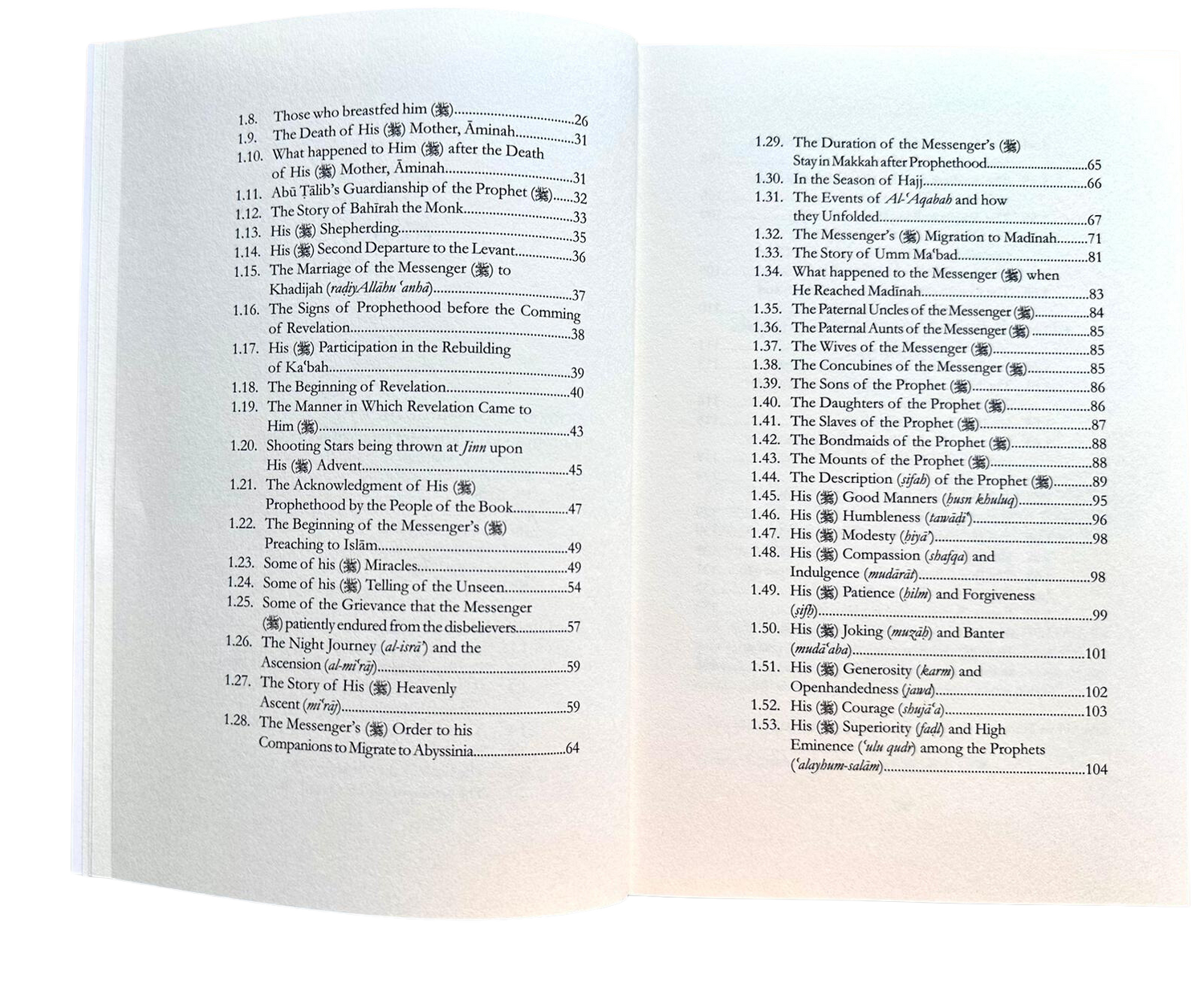 1.10. Ce qui lui est arrivé après sa mort. 1.8. Ceux qui l'ont allaité. 1.9. La mort de sa mère, Aminah........ de sa mère, Aminah.. 26 .31 1.11. La tutelle du Prophète () par Abu Talib.....32 1.12. L'histoire de Bahirah le moine.. 31 1.29. La durée du séjour du Messager () à La Mecque après sa prophétie....... 1.30. Pendant la saison du Hajj....... ..65 .66 1.31. Les événements d'Al-'Aqabah et comment ..33 ils se sont déroulés..... .67 1.13. Son rôle de berger......... ..35 1.14. Son second départ pour le Levant.. ..36 1.32. L'émigration du Messager (que la paix et les bénédictions soient sur lui) à Médine.........71 1.33. L'histoire d'Umm Ma'bad.. .81 1.15. Le mariage du Messager (que la paix et les bénédictions soient sur lui) avec Khadija (qu'Allah l'agrée). 1.34. Ce qui est arrivé au Messager (que la paix et les bénédictions soient sur lui) lorsqu'il est arrivé à Médine.... .83 .........37 1.16. Les signes de la prophétie avant la révélation... .38 1.17. Sa participation à la reconstruction de la Kaaba..... .39 1.18. Le début de la révélation... 40 1.19. La manière dont la révélation lui est parvenue... 43 1.20. Les étoiles filantes lancées sur les djinns lors de son avènement......... 1.35. Les oncles paternels du Messager (que la paix et les bénédictions soient sur lui).. 1.36. Les tantes paternelles du Messager (que la paix et les bénédictions soient sur lui). 1.37. Les épouses du Messager (). 1.38. Les concubines du Messager (). 1.39. Les fils du Prophète (). 1.40. Les filles du Prophète (). 1.41. Les esclaves du Prophète (). 1.42. Les servantes du Prophète (). 1.43. Les montures du Prophète ().. .84 .85 .85 .85 .86 ..86 ..87 ..88 ..88 ..45 1.21. La reconnaissance de Sa (). 1.44. La description (sifab) du Prophète (). 1.45. Ses bonnes manières (busn khuluq). ..89 ..95 La prophétie par les Gens du Livre... .47 1.46. Son humilité (tawadi)... 96 1.22. Le début de la prédication du Messager (que la paix et les bénédictions soient sur lui) à l'Islam..... 1.47. Sa modestie (biya)... ..98 49 1.23. Quelques-uns de ses miracles..... 49 1.48. Sa compassion (shafqa) et son indulgence (mudarat)..... 98 1.24. Quelques-unes de ses révélations sur l'invisible........ 1.25. Quelques-unes des souffrances que le Messager (que la paix et les bénédictions soient sur lui) a patiemment endurées de la part des mécréants...... 1.26. Le voyage nocturne (al-isra') et l'ascension (al-mira))... 54 1.49. Sa patience (bilm) et son pardon (sifh). .99 57 1.50. Ses plaisanteries (muzah) et ses badinages (muda'aba). 101 ..59 1.27. L'histoire de son (*) Ascension céleste (miraj). 1.51. Sa () Générosité (karm) et sa () hospitalité (jawd)... 102 1.52. Son () Courage (shujaa).. ..103 1.28. L'ordre du Messager (*) à ses Compagnons d'émigrer en Abyssinie.. ..64 1.53. Sa () Supériorité (fadl) et sa haute éminence (ulu qudr) parmi les Prophètes ('alayhum-salam)... 104