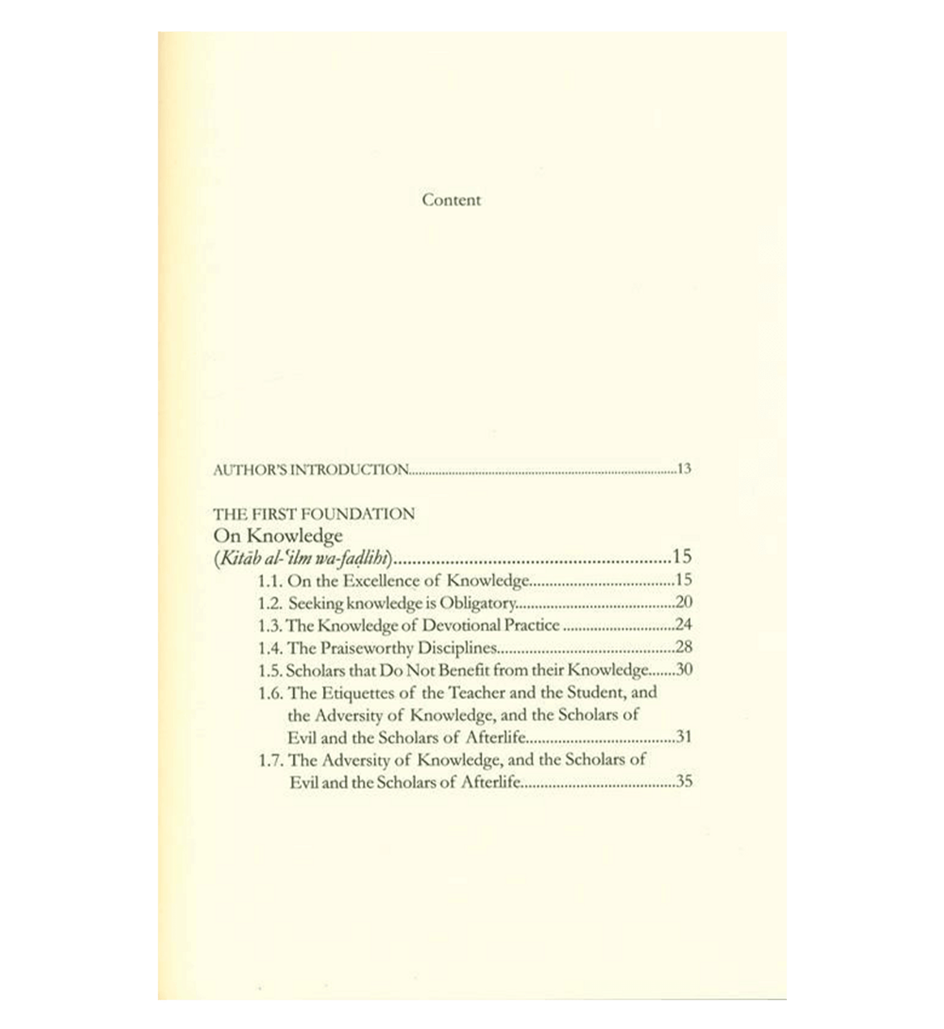 Table des matières INTRODUCTION DE L'AUTEUR... LE PREMIER FONDEMENT Sur la connaissance (Kitab al-'ilm wa-faḍlihi)... 1.1. De l'excellence de la connaissance.. 13 15 15 1.2. La recherche de la connaissance est obligatoire....... ..20 1.3. La connaissance de la pratique dévotionnelle. ..24 1.4. Les disciplines louables.... .28 1.5. Les savants qui ne tirent aucun profit de leur connaissance... 1.6. L'étiquette du maître et de l'élève, et 30 l'adversité de la connaissance, et les savants du mal et les savants de l'au-delà... .31 1.7. L'adversité de la connaissance, et les savants du mal et les savants de ............................. 35