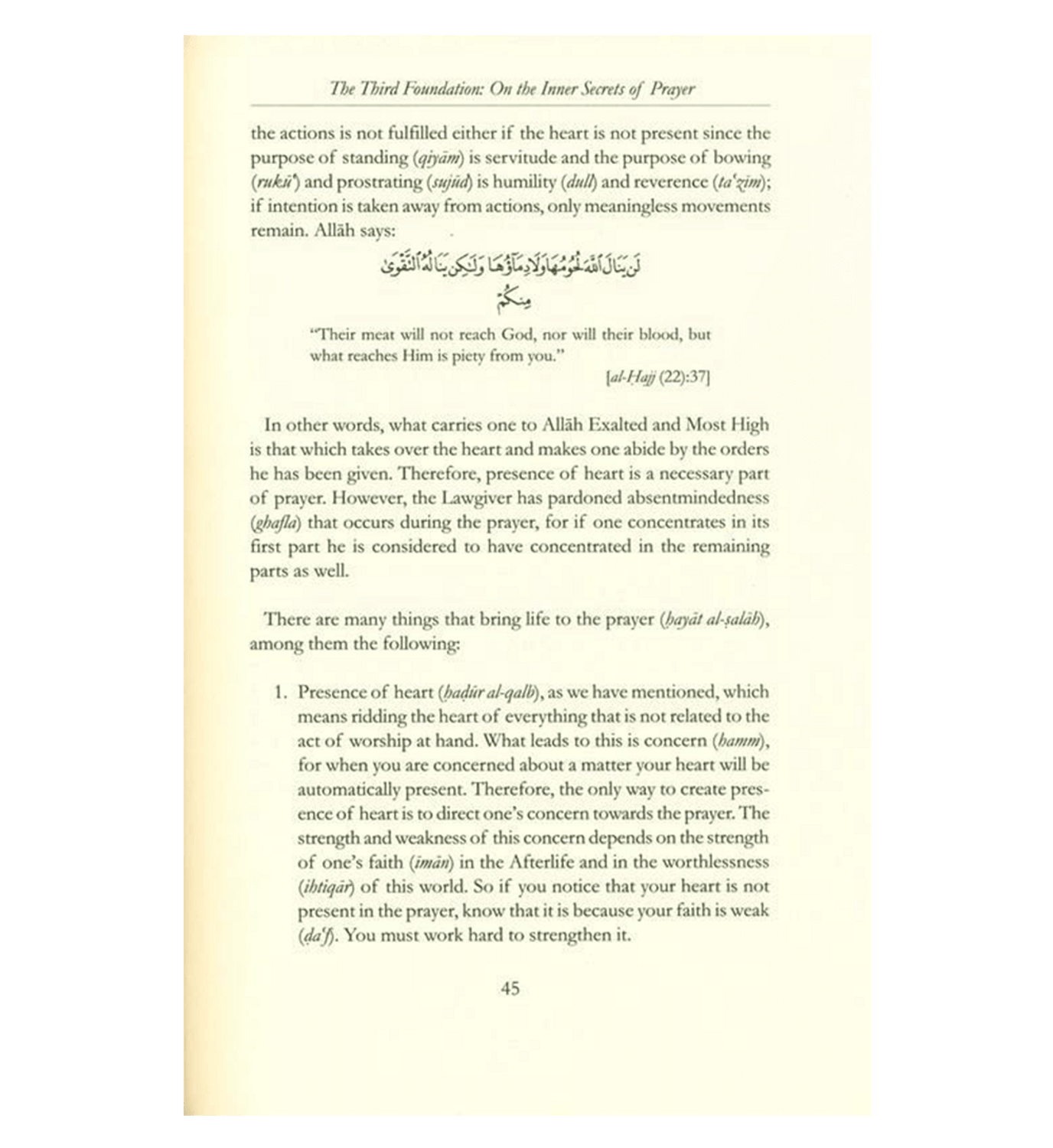 Le troisième fondement : Sur les secrets intérieurs de la prière, les actions ne sont pas accomplies non plus si le cœur n'est pas présent puisque le but de se tenir debout (qiyam) est la servitude et le but de s'incliner (ruki) et de se prosterner (sujud) est l'humilité (dull) et la révérence (ta'zim) ; si l'intention est retirée des actions, il ne reste que des mouvements insignifiants. Allah dit : لن ينال اللهَ لُحُومُهَا وَلَا دِمَاؤُهَا وَلَكِن يَنَالُهُ التَّقْوَى مِنكُمْ "Leur viande n'atteindra pas Dieu, ni leur sang, mais ce qui lui parvient, c'est la piété de votre part. [al-Hajj (22): 37] En d'autres termes, ce qui amène quelqu'un vers Allah Exalté et Très-Haut est ce qui prend le contrôle du cœur et fait respecter les ordres qui lui ont été donnés. La présence du cœur est donc une partie nécessaire de la prière. Cependant, le Législateur a pardonné la distraction (ghafla) qui survient pendant la prière, car si l'on se concentre sur sa première partie, on est considéré comme concentré sur les suivantes également. De nombreux éléments donnent vie à la prière (hayat al-salah), parmi lesquels : 1. La présence du cœur (hadur al-qalb), comme nous l'avons mentionné, c'est-à-dire débarrasser son cœur de tout ce qui n'est pas lié à l'acte d'adoration en cours. Ceci est favorisé par le souci (hamm), car lorsque l'on est préoccupé par une chose, le cœur est automatiquement présent. Par conséquent, le seul moyen de créer la présence du cœur est de diriger son souci vers la prière. L'intensité de ce souci dépend de la force de la foi (iman) en l'Au-delà et en la vanité (ihtigar) de ce monde. Ainsi, si vous constatez que votre cœur n'est pas présent pendant la prière, sachez que c'est parce que votre foi est faible (daf). Vous devez travailler dur pour la renforcer. 45