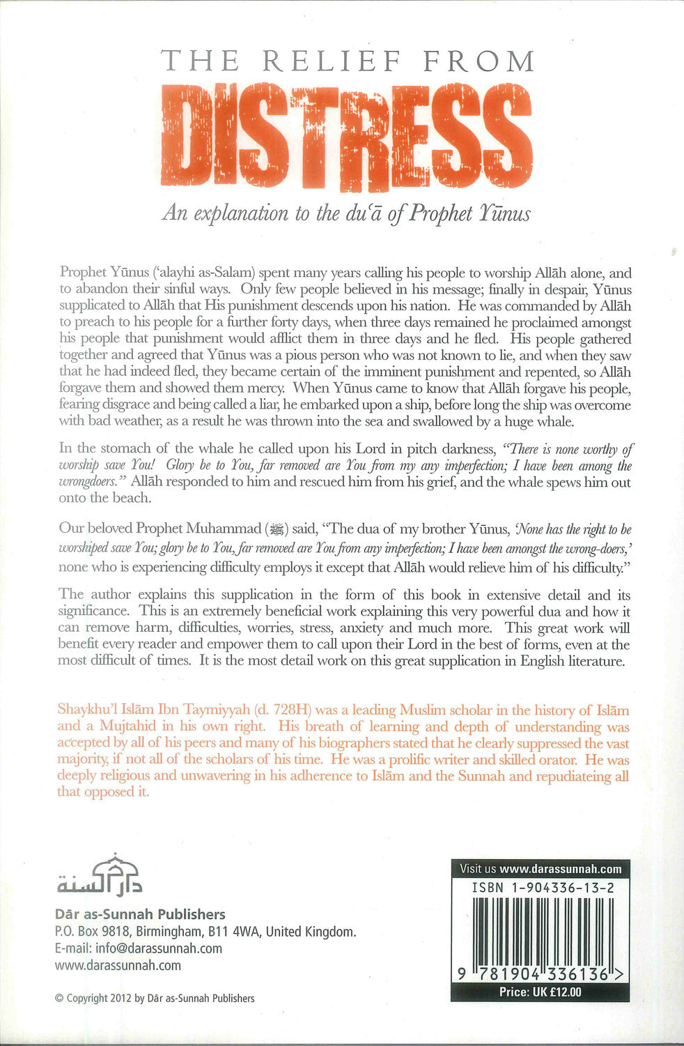 LE SOULAGEMENT DE LA DÉTRESSE Explication de l'invocation du Prophète Yunus Le Prophète Yunus (que la paix soit sur lui) passa de nombreuses années à appeler son peuple à adorer Allah seul et à abandonner ses voies pécheresses. Seuls quelques-uns crurent en son message ; finalement, désespéré, Yunus implora Allah de faire s'abattre Son châtiment sur sa nation. Allah lui ordonna de prêcher à son peuple pendant quarante jours supplémentaires. À trois jours de l'échéance, il proclama parmi son peuple que le châtiment les frapperait dans trois jours et il s'enfuit. Son peuple se rassembla et reconnut en Yunus un homme pieux, connu pour ne jamais mentir. Voyant qu'il avait effectivement fui, ils prirent la certitude du châtiment imminent et se repentirent. Allah leur pardonna et leur fit miséricorde. Lorsque Jonas apprit qu'Allah avait pardonné à son peuple, craignant le déshonneur et d'être traité de menteur, il embarqua sur un navire. Peu après, une violente tempête le prit à la mer et il fut jeté à la mer et avalé par une baleine immense. Dans le ventre de la baleine, dans l'obscurité la plus totale, il implora son Seigneur : « Il n'y a de divinité digne d'adoration que Toi ! Gloire à Toi ! Tu es loin de toute imperfection ; j'ai été du nombre des injustes. » Allah lui répondit et le délivra de son chagrin, et la baleine le rejeta sur la plage. Notre bien-aimé Prophète Muhammad (que la paix et les bénédictions soient sur lui) a dit : « L'invocation de mon frère Yunus : "Nul n'a le droit d'être adoré si ce n'est Toi ; gloire à Toi, Tu es au-delà de toute imperfection ; j'ai été parmi les injustes", quiconque traverse une épreuve l'utilise sans qu'Allah ne le soulage de sa difficulté. » L'auteur explique cette invocation en détail dans cet ouvrage, ainsi que sa signification. Ce livre est extrêmement bénéfique car il explique cette invocation très puissante et comment elle peut dissiper le mal, les difficultés, les soucis, le stress, l'anxiété et bien plus encore. Ce livre remarquable sera profitable à chaque lecteur et lui permettra d'invoquer son Seigneur de la meilleure façon, même dans les moments les plus difficiles. Il s'agit de l'ouvrage le plus complet sur cette grande invocation dans la littérature anglaise. Cheikh al-Islam Ibn Taymiyya (décédé en 728 H) était un éminent savant musulman de l'histoire de l'Islam et un mujtahid reconnu. Son érudition et la profondeur de sa compréhension étaient unanimement reconnues par ses pairs, et nombre de ses biographes affirment qu'il a clairement dominé la grande majorité des idées reçues. Il n'était pas l'un des érudits de son époque. Écrivain prolifique et orateur de talent, il était profondément religieux et inébranlable dans son attachement à l'islam et à la Sunna, rejetant tout ce qui s'y opposait. Visitez-nous sur www.darassunnah.com ISBN 1-904336-13-2 Där as-Sunnah Publishers PO Box 9818, Birmingham, B11 4WA, Royaume-Uni. Courriel : info@darassunnah.com www.darassunnah.com Copyright 2012 par Där as-Sunnah Publishers 9781904 336136"> Prix : 12 £ (Royaume-Uni)