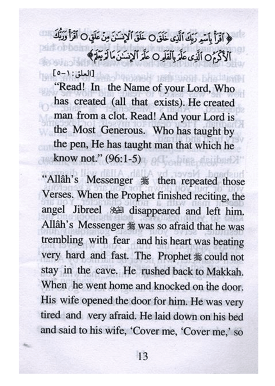Il resta dans la grotte. Il retourna précipitamment à La Mecque. Arrivé chez lui, il frappa à la porte. Sa femme lui ouvrit. Il était épuisé et terrifié. Il se coucha sur son lit et dit à sa femme : « Couvre-moi, couvre-moi ! »