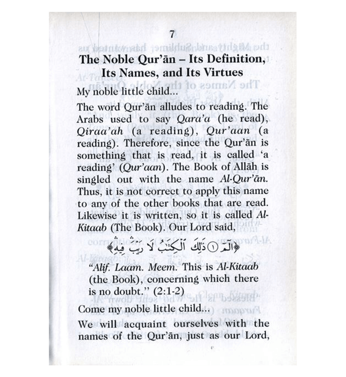 Le mot Coran fait allusion à la lecture. Les Arabes disaient Qara'a (il a lu), Qiraa'ah (une lecture), Qur'aan (une lecture). Ainsi, puisque le Coran est un ouvrage qui se lit, il est appelé « une lecture » (Coran). Le Livre d'Allah est désigné par le nom d'Al-Qur'an. Il est donc incorrect d'appliquer ce nom à tout autre livre lu. De même, il est écrit, c'est pourquoi on l'appelle Al-Kitab (Le Livre). Notre Seigneur a dit :
