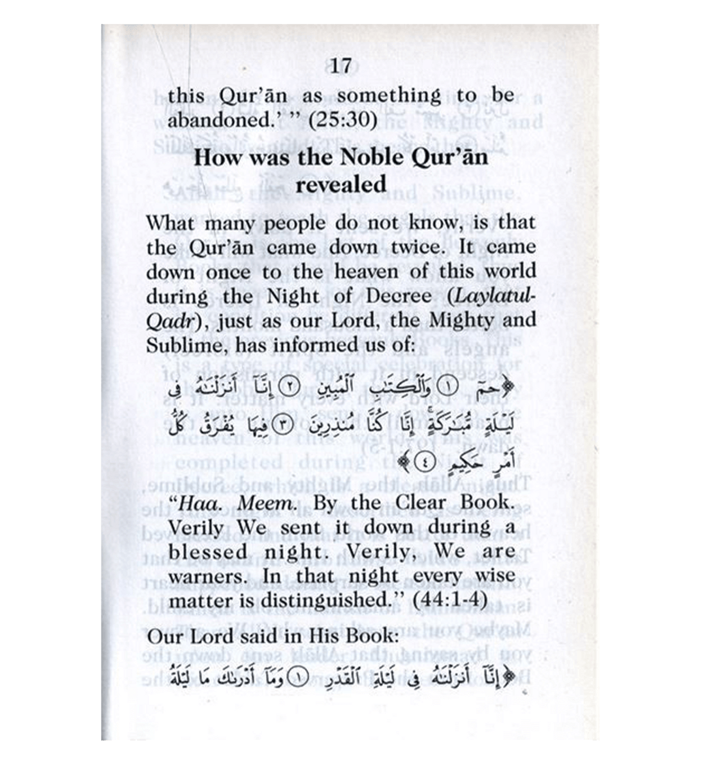 « Par le Livre Clair. En vérité, Nous l'avons fait descendre durant une nuit bénie. En vérité, Nous sommes des avertisseurs. Durant cette nuit, toute matière sage est distinguée. » (44:1-4)