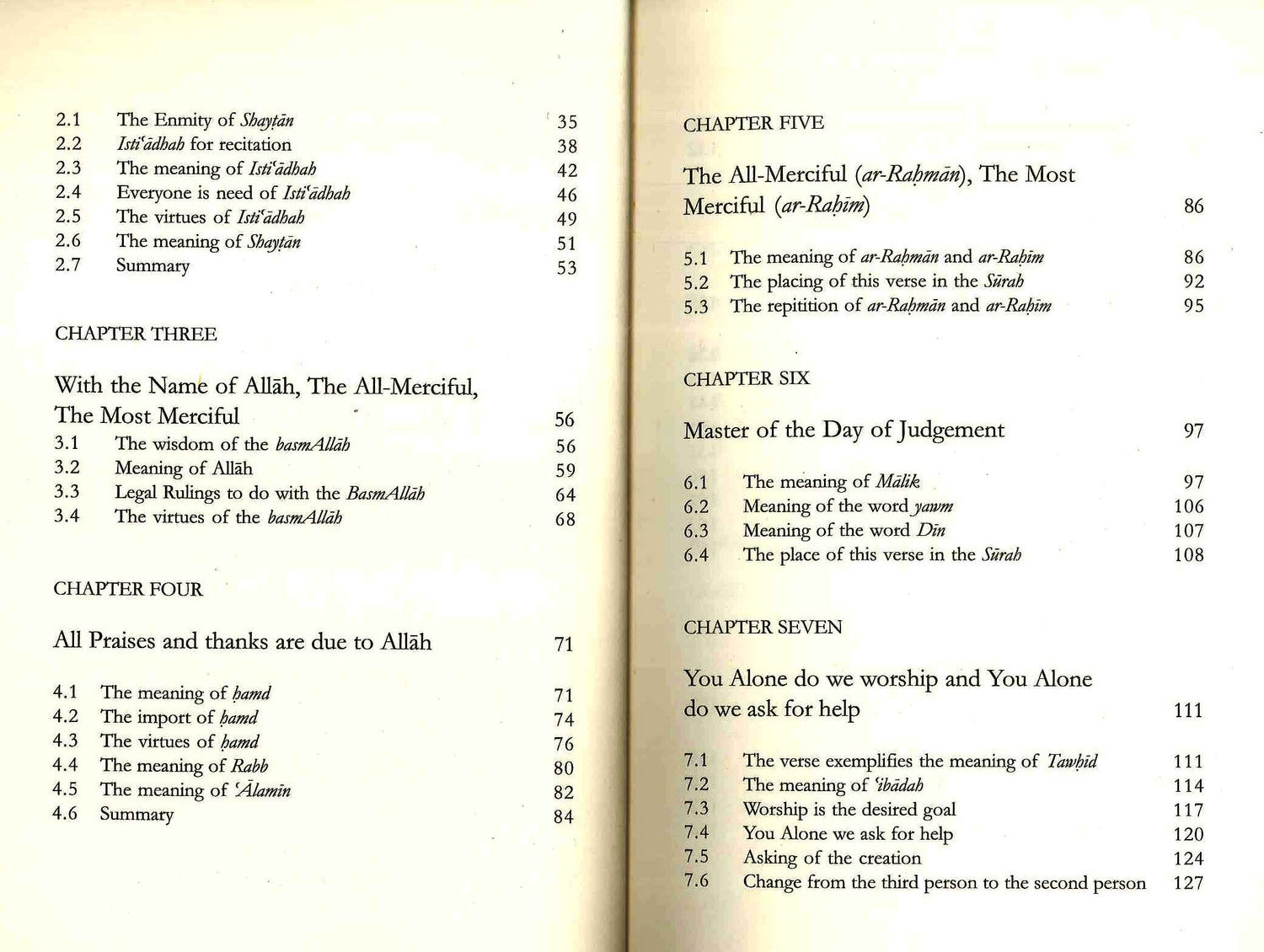 Selon certains pieux prédécesseurs (Salaf), la sourate Al-Fatiha, premier chapitre du Coran, aurait été accueillie par un cri de lamentation de Satan. Son importance réside dans son invitation à la contemplation et à la sérénité, car elle nous exhorte à méditer sur les Noms et Attributs d'Allah, Sa création et le Jour du Jugement. Ce chapitre souligne l'importance de l'accomplissement du Tawhid, la croyance en l'Unicité de Dieu, à trente reprises et constitue un résumé concis du Coran.