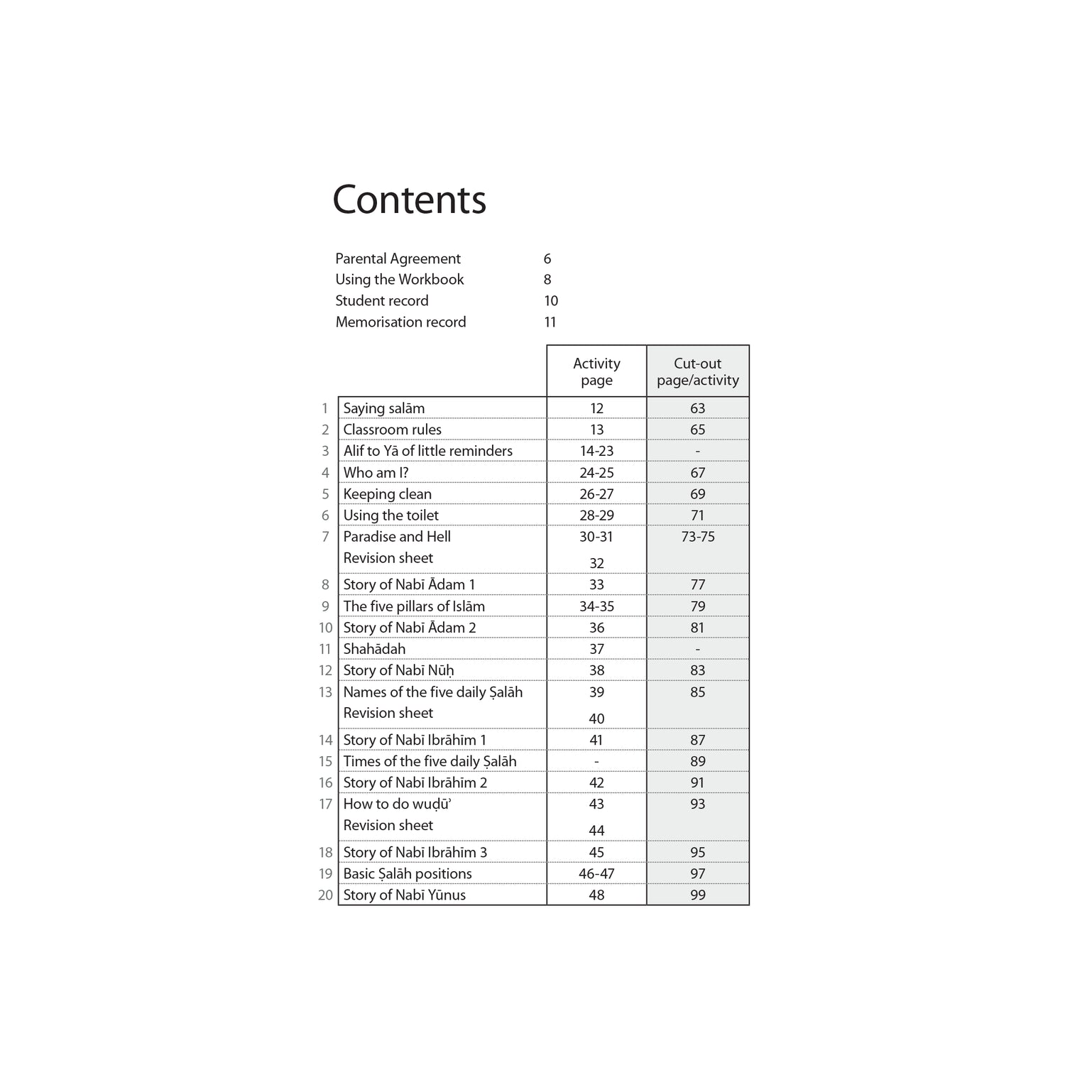 Covering key topics such as beliefs (Aqeedah), acts of worship (Ibadah), Islamic morals (Akhlaq), and inspiring stories of the Prophets, the workbook uses activities, illustrations, and quizzes to make learning fun and meaningful.