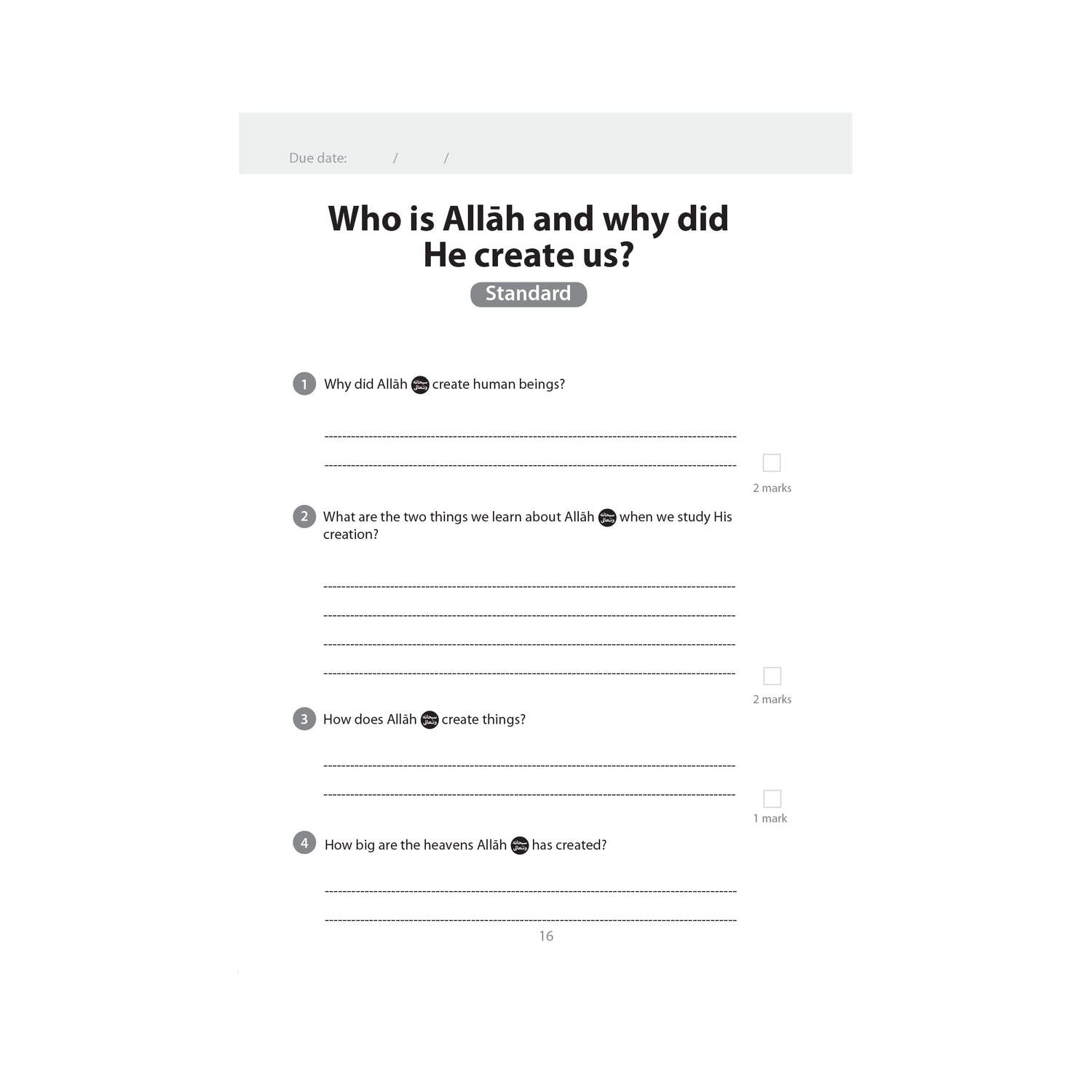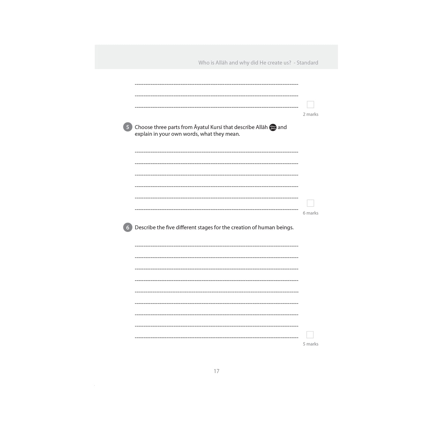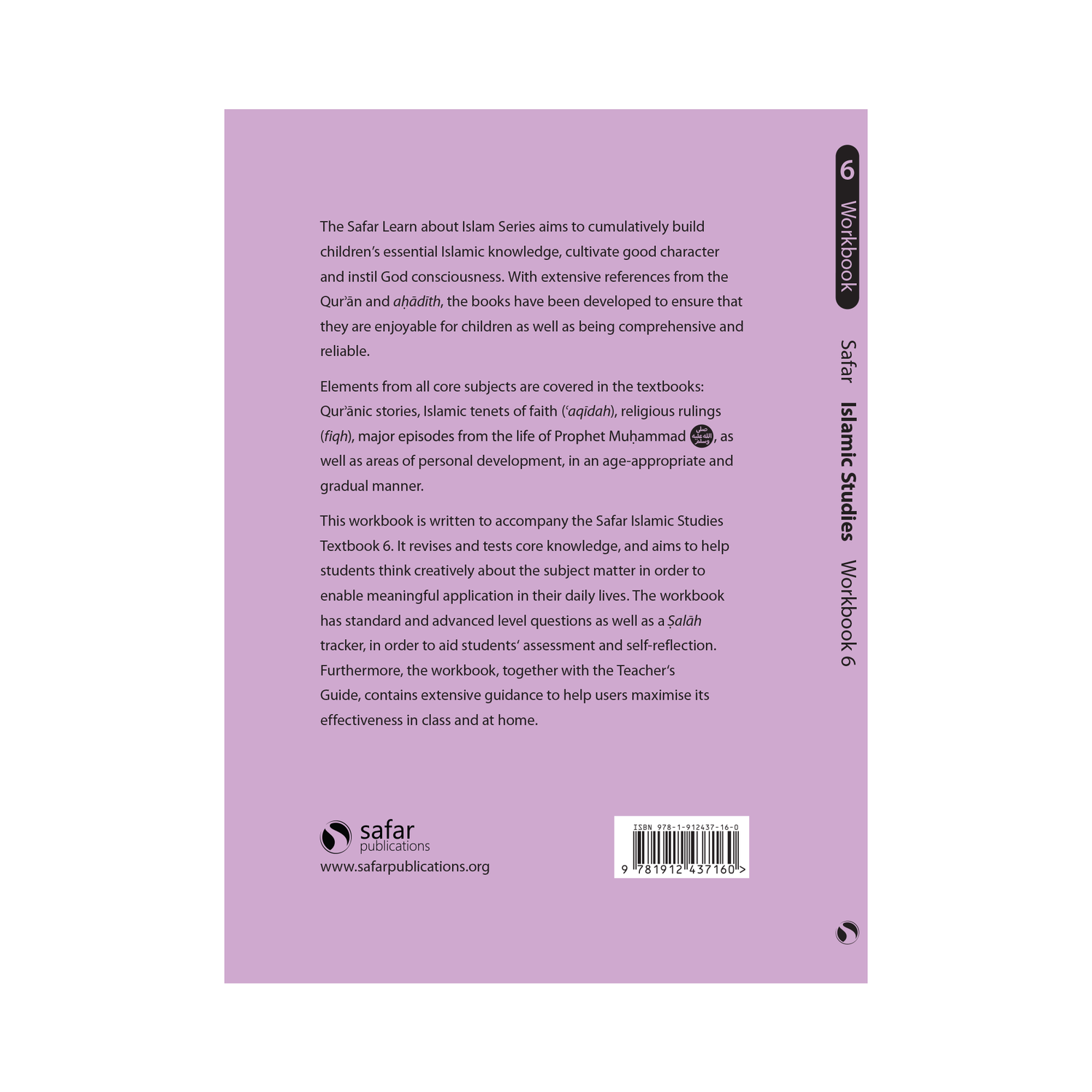 This workbook is written to accompany the Safar Islamic Studies Textbook 6. It revises and tests core knowledge, and aims to help students think creatively about the subject matter in order to enable meaningful application in their daily lives. The workbook has standard and advanced level questions as well as a Salāh tracker, in order to aid students' assessment and self-reflection. Furthermore, the workbook, together with the Teacher's