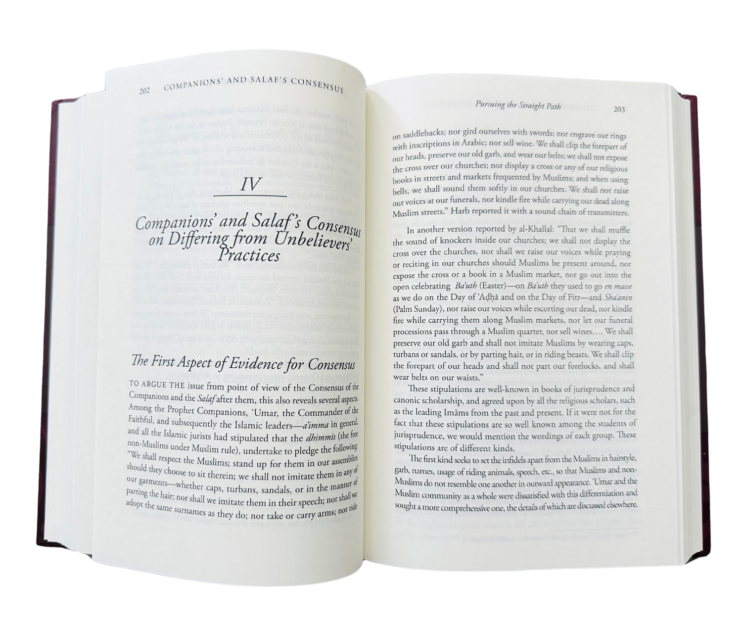 202 COMPANIONS' AND SALAF'S CONSENSUS IV Companions and Salaf's Consensus on Differing from Unbelievers Practices The First Aspect of Evidence for Consensus TO ARGUE THE issue from point of view of the Consensus of the Companions and the Salaf after them, this also reveals several aspects. Among the Prophet Companions, 'Umar, the Commander of the Faithful, and subsequently the Islamic leaders-d'imma in general, and all the Islamic jurists had stipulated that the dhimmis (the free non-Muslims under Muslim rule), undertake to pledge the following "We shall respect the Muslims; stand up for them in our assemblies should they choose to sit therein; we shall not imitate them in any of our garments-whether caps, turbans, sandals, or in the manner of parting the hair; nor shall we imitate them in their speech; nor shall we adopt the same surnames as they do; nor take or carry arms; nor ride 20 Pursuing the Straight Path 203 on saddlebacks; nor gird ourselves with swords; nor engrave our rings with inscriptions in Arabic; nor sell wine. We shall clip the forepart of our heads, preserve our old garb, and wear our belts; we shall not expose the cross over our churches; nor display a cross or any of our religious books in streets and markets frequented by Muslims; and when using bells, we shall sound them softly in our churches. We shall not raise our voices at our funerals, nor kindle fire while carrying our dead along Muslim streets." Harb reported it with a sound chain of transmitters. In another version reported by al-Khallal: "That we shall muffle the sound of knockers inside our churches; we shall not display the cross over the churches, nor shall we raise our voices while praying or reciting in our churches should Muslims be present around, nor expose the cross or a book in a Muslim market, nor go out into the open celebrating Bauth (Easter)-on Bauth they used to go en masse as we do on the Day of 'Adha and on the Day of Fitr-and Sha'anin (Palm Sunday), nor raise our voices while escorting our dead, nor kindle fire while carrying them along Muslim markets, nor let our funeral processions pass through a Muslim quarter, nor sell wines.... We shall preserve our old garb and shall not imitate Muslims by wearing caps, turbans or sandals, or by parting hair, or in riding beasts. We shall clip the forepart of our heads and shall not part our forelocks, and shall wear belts on our waists." These stipulations are well-known in books of jurisprudence and canonic scholarship, and agreed upon by all the religious scholars, such as the leading Imams from the past and present. If it were not for the fact that these stipulations are so well known among the students of jurisprudence, we would mention the wordings of each group. These stipulations are of different kinds. The first kind seeks to set the infidels apart from the Muslims in hairstyle, garb, names, usage of riding animals, speech, etc., so that Muslims and non- Muslims do not resemble one another in outward appearance. "Umar and the Muslim community as a whole were dissatisfied with this differentiation and sought a more comprehensive one, the details of which are discussed elsewhere.